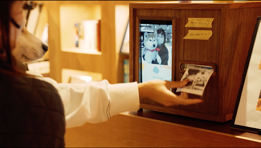 わんちゃんと一緒に撮影。その場で印刷され、一枚はブースに、一枚は記念のお持ち帰り用に。
