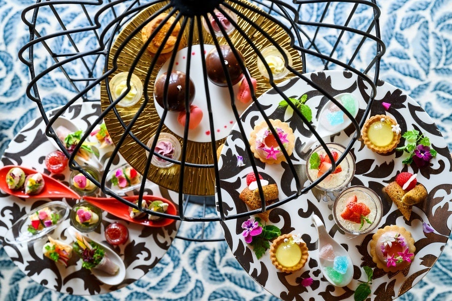 シーズンごとにテーマを変える「アリビラ バードケージ アフタヌーンティー」は、鳥かごをイメージしたアリアカラの内装やインテリアをヒントに制作した、約140㎝のオリジナルティースタンドで提供します。