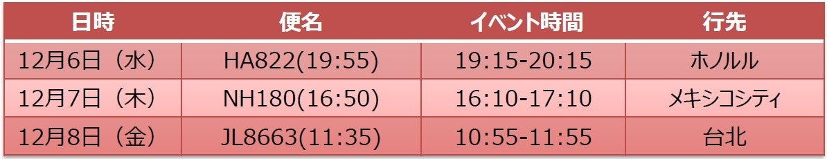 お客様への日頃の感謝の気持ちと、楽しいクリスマスホリデーをお過ごしいただきたいという想いを込めて、ハワイアン航空、全日本空輸、日本航空、の3便のお見送りを行います。また、当該便をご利用のお客様には、お見送り対象便限定のお菓子をプレゼントします。