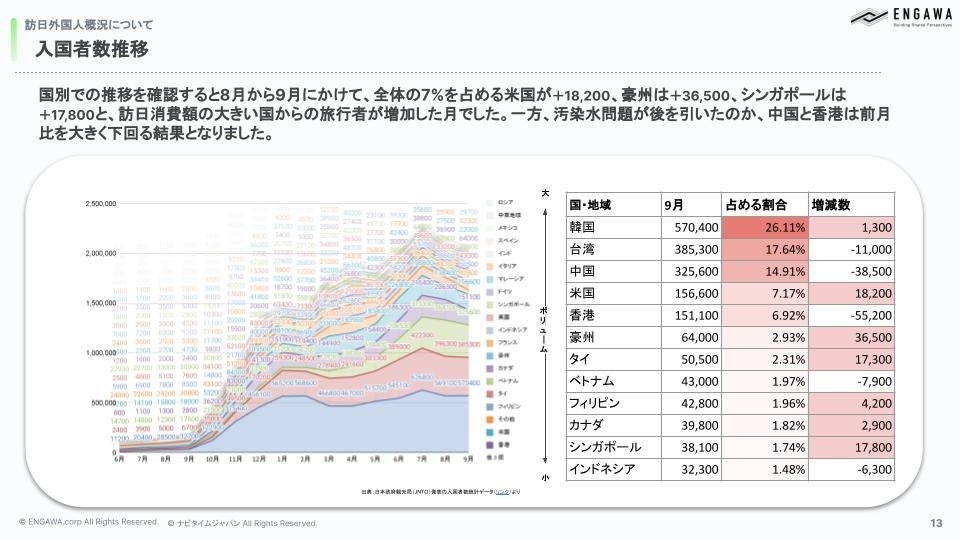 インバウンドに関する各所のデータを用いて、最新の動向や傾向を説明。