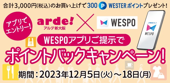 11月28日(火)~11月30日(木)までの期間中、アルデ新大阪でWESPOアプリまたはWESTERアプリを提示してポイントをためると、通常は110円(税込)で1ポイントのところ、110円(税込)で5ポイントたまります!!