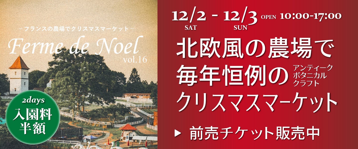 こもれび 森のイバライドにて、クリスマスマーケット「フェルム・ド・ノエルvol.16」(主催:IKINA MARKET) を12月2日(土)、3日(日)の2日間開催することが決定しました。開催期間中はイバライドの入園料が半額となるため、大変お得にご参加いただくことができます。クリスマスをテーマにしたこのイベントは、ファームエリアを新たに広げ、アンティーク、古道具、ボタニカル、クラフト作品を取り扱うショップが、全国各地から過去最高出店数の約200店舗が皆様をお出迎えいたします。
