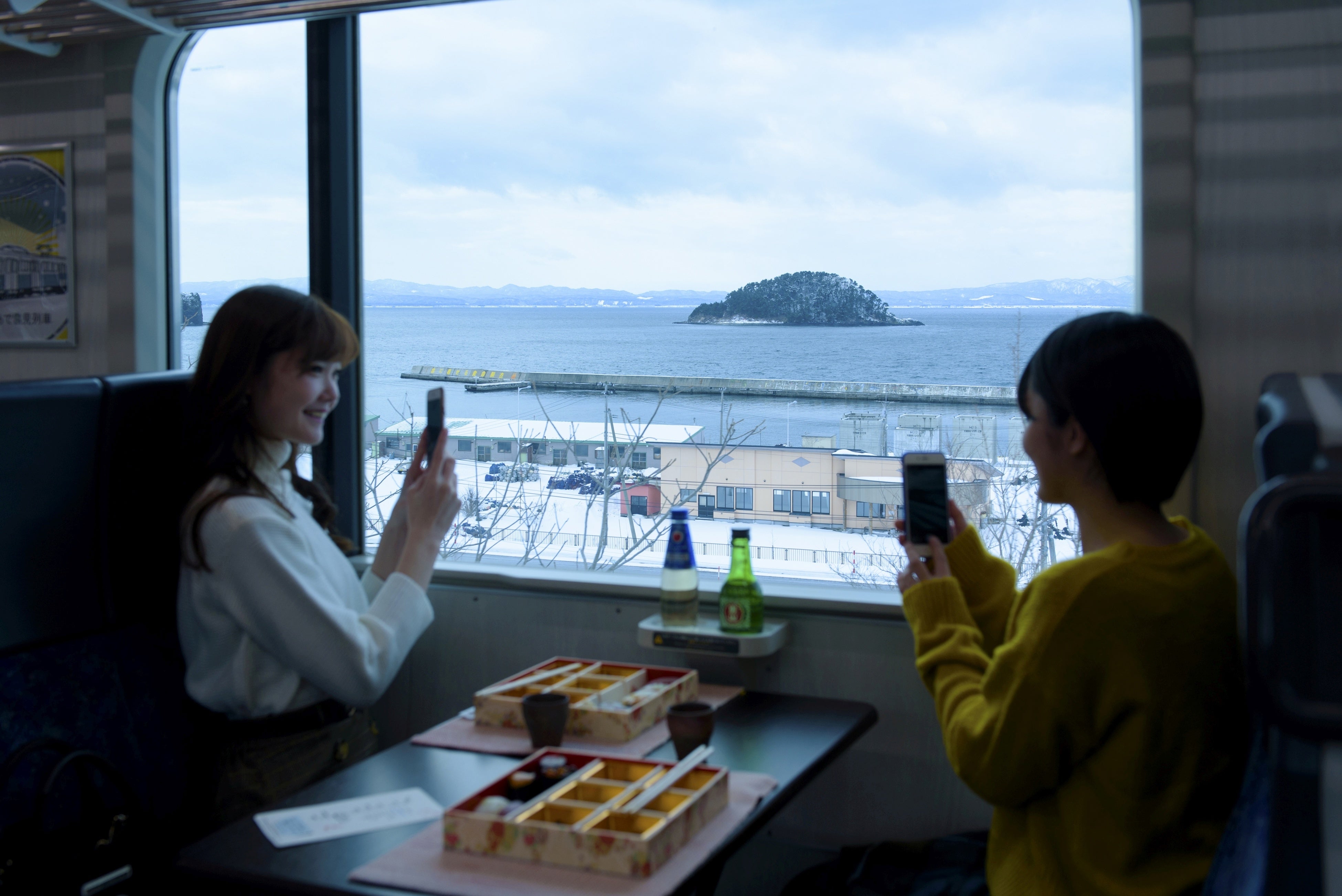青い森鉄道は、岩手県との県境の目時駅から、青森県の南部地方にある八戸駅を経由して、津軽地方にある青森駅を結ぶ鉄道です。本観光列車は、速度や停車駅を自由に設定できる特別ダイヤで運行します。そのため、通常ダイヤではすぐに通過してしまう場所でも、景色が良いところではゆっくり走行できます。酒のあで雪見列車を運行する期間は、青森では降雪量が多い時期のため、雪原風景や荒波が打ちつける陸奥(むつ)湾など、雪国ならではの景色を楽しめるのが特徴です。