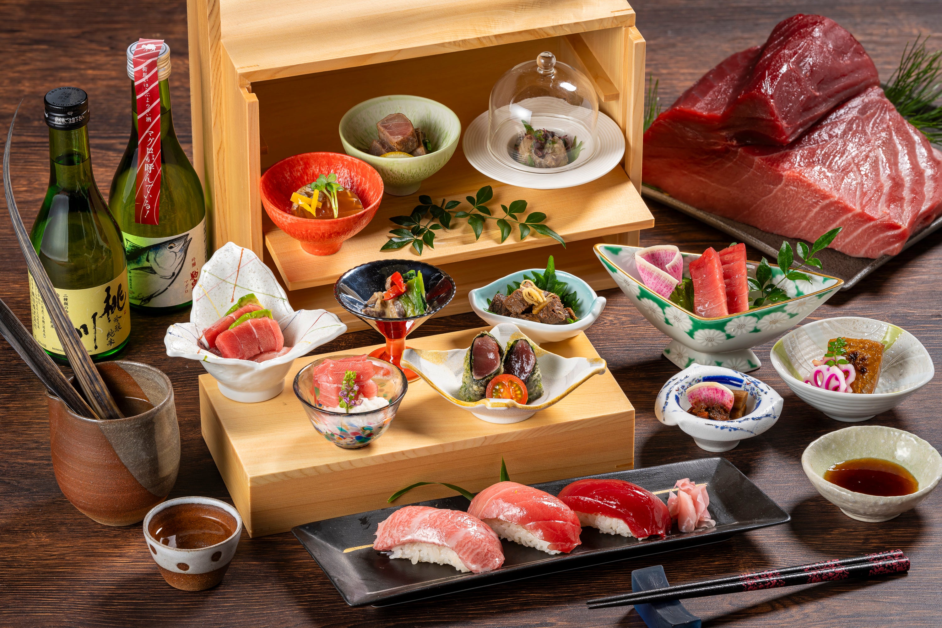 列車内では、青森の味覚の代表格の鮪を満喫できる、鮪尽くしのあでセットを提供します。「本鮪のお造り」や「鮪のにぎり寿司」など、王道の鮪料理に加え、鮪のワタ(*3)を使用したぬた和え(*4)など、普段なかなか食べる機会がない部位も味わうことができます。また、あでセットと一緒に提供するのは、青森の3つの酒蔵が厳選した鮪に合う地酒です。地酒とのペアリングにより、鮪の旨味をより深く楽しめます。