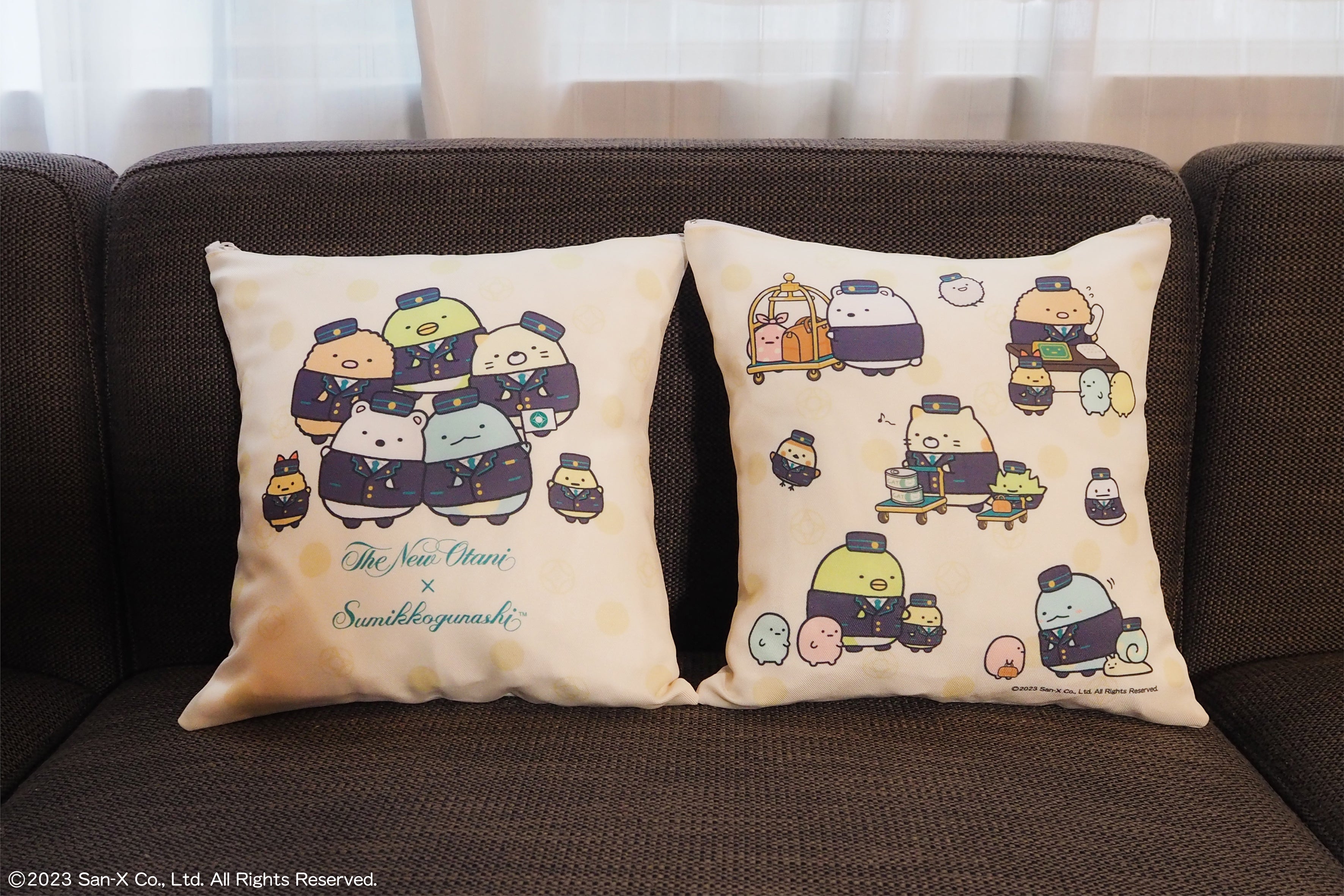 宿泊した方だけが購入できる限定販売グッズもご用意いたしました。今回のオリジナルアートを使用した「コラボクッションカバー」は、ホテルスタッフに扮したすみっコたちが大集合のリバーシブルスタイル。その日の気分に合わせてお楽しみいただけます。