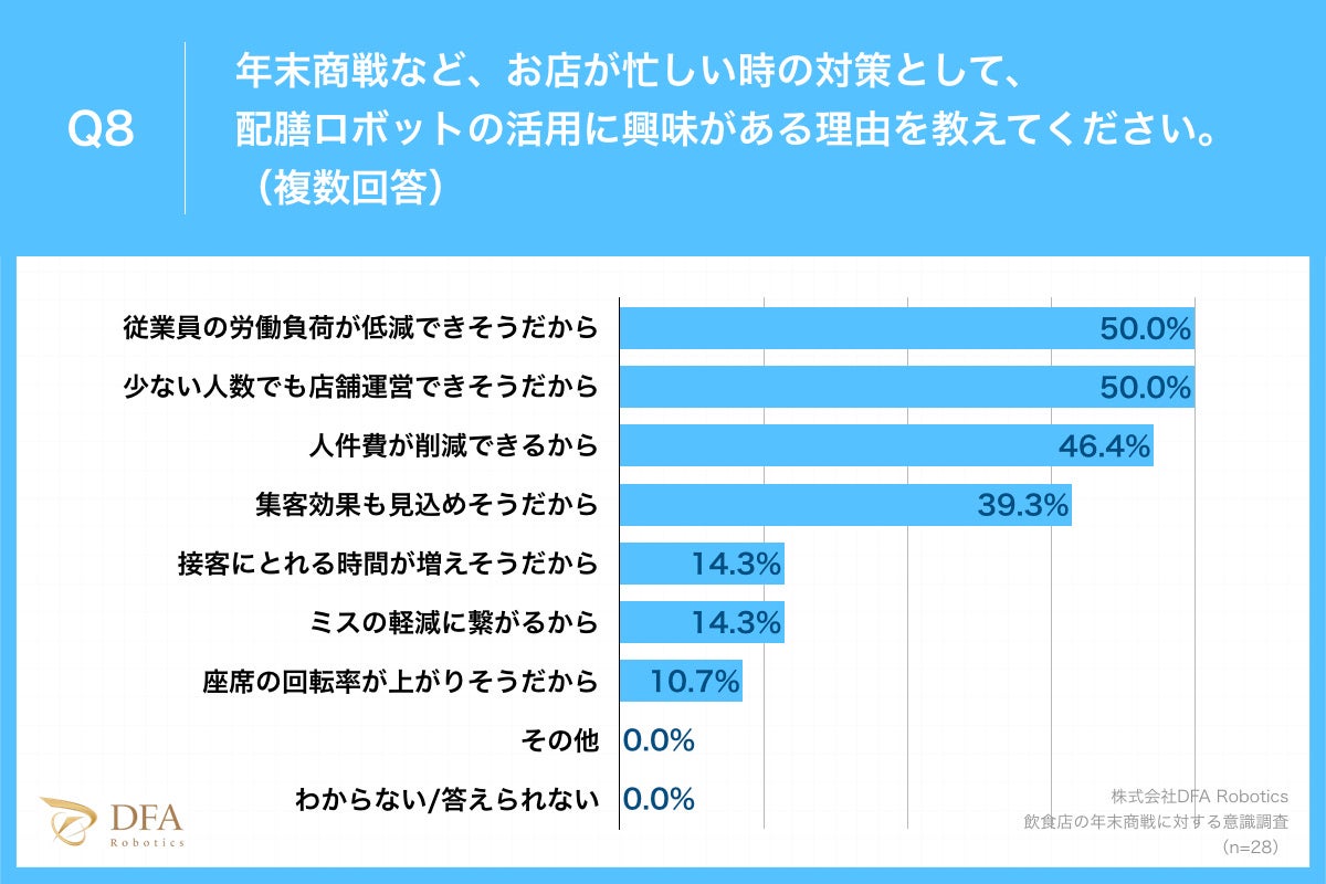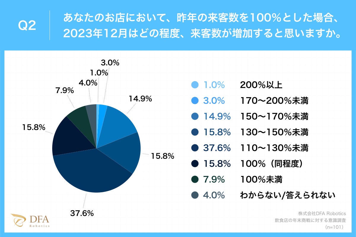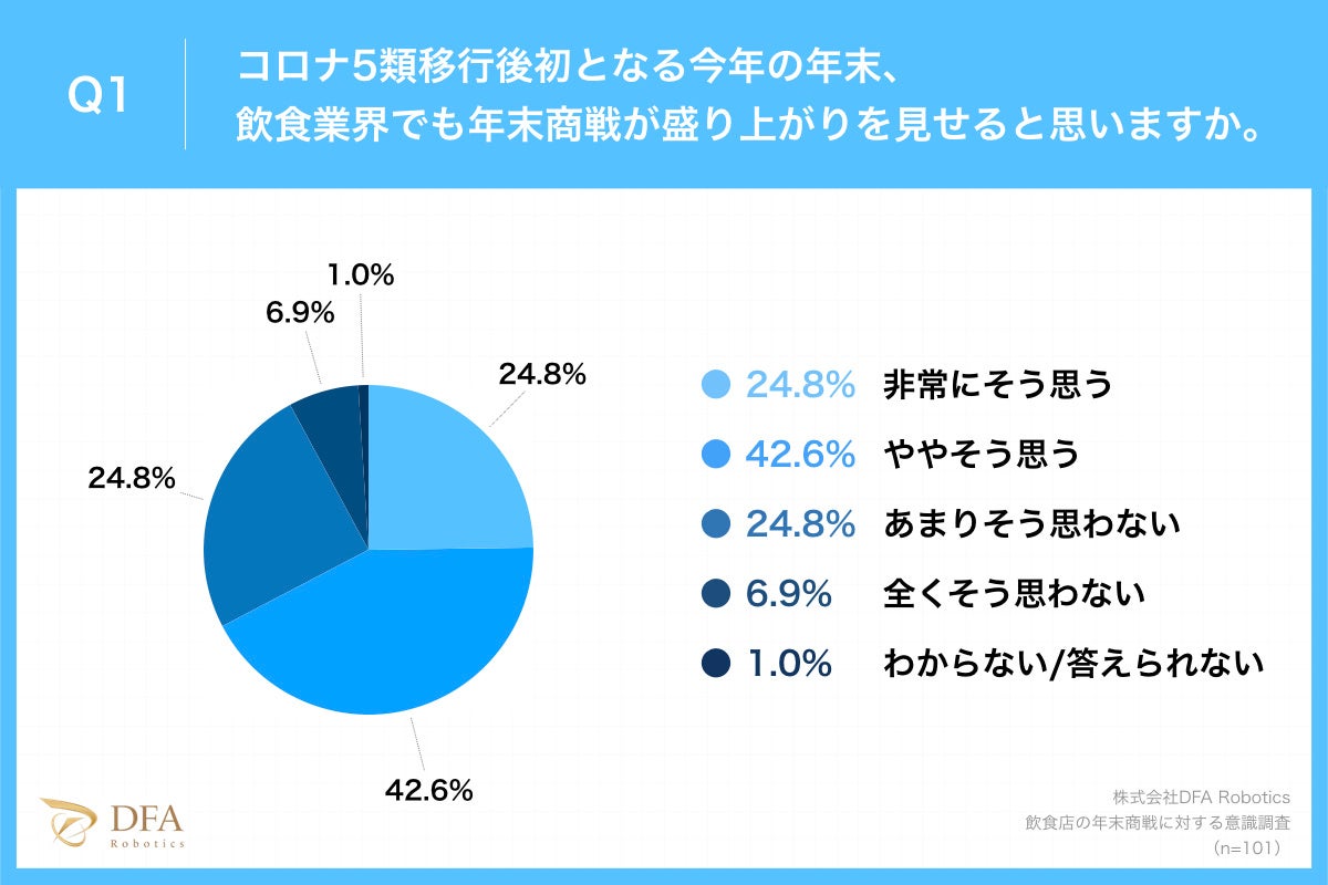 飲食店DXを推進するロボティクスソリューションカンパニーである株式会社DFA Robotics(本社:東京都渋谷区恵比寿、代表取締役:波多野昌昭)は、飲食業の店舗責任者(勤続年数1年以上)101名に対してアンケート調査を行い、飲食店の年末商戦に対する意識調査と共に店舗運営の実態および配膳ロボット導入についてまとめ、「飲食店の年末商戦に対する意識調査レポート」として発表したことをお知らせいたします。