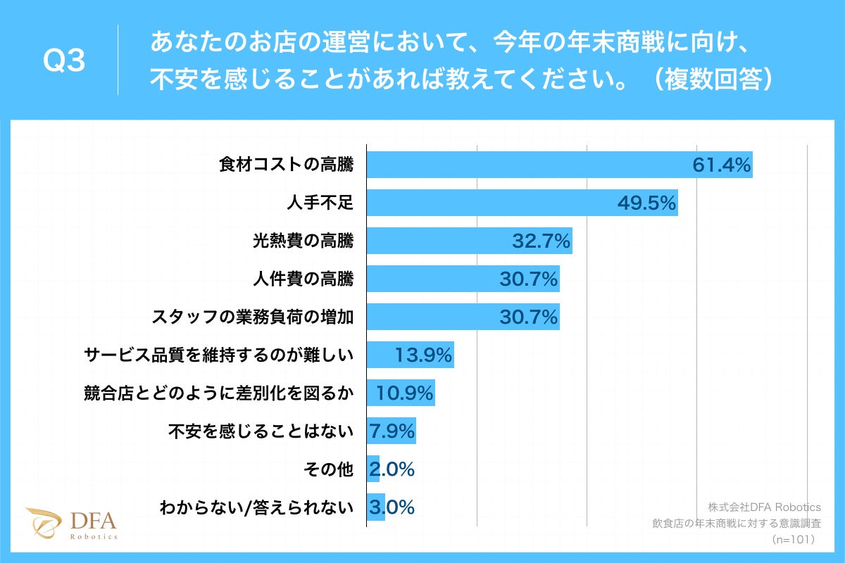 一方で、年末商戦に関する不安要素については、第1位「食材コストの高騰」(61.4%)、第2位「人手不足」(49.5%)という結果が出ています。