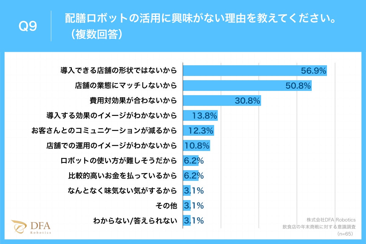 一方で、配膳ロボット活用への興味は「あまりない」「全くない」と回答した方に、その理由について質問したところ、「導入できる店舗の形状ではないから」が56.9%、「店舗の業態にマッチしないから」が50.8%、「費用対効果が合わないから」が30.8%という回答となりました。