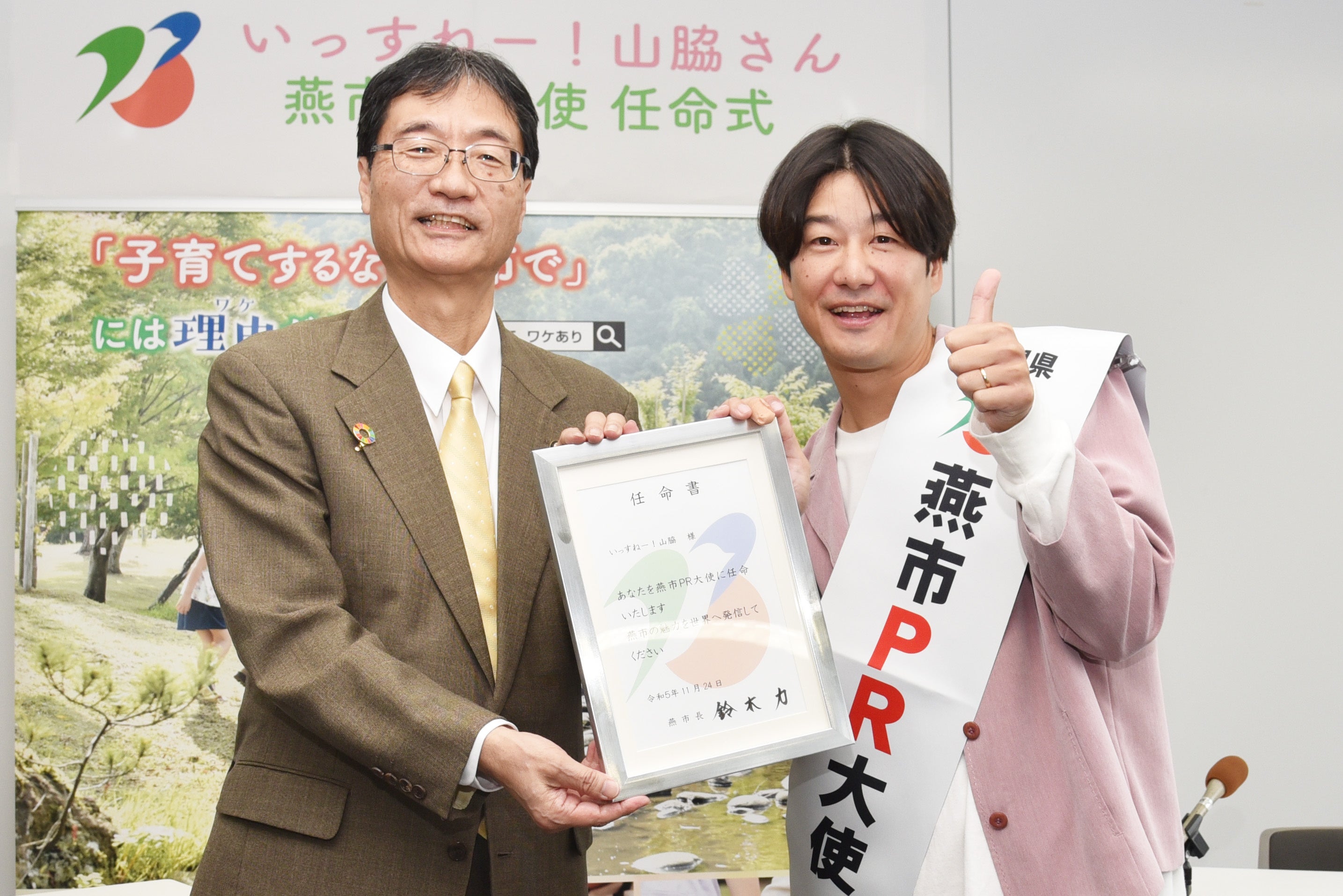 新潟県住みます芸人のいっすねー!山脇は、新潟県内のテレビや雑誌などさまざまな場面で活躍しており、この度、新潟県燕市のPR大使に任命いただくことになり、11月24日(金)、新潟県燕市役所にて任命式が行われました。