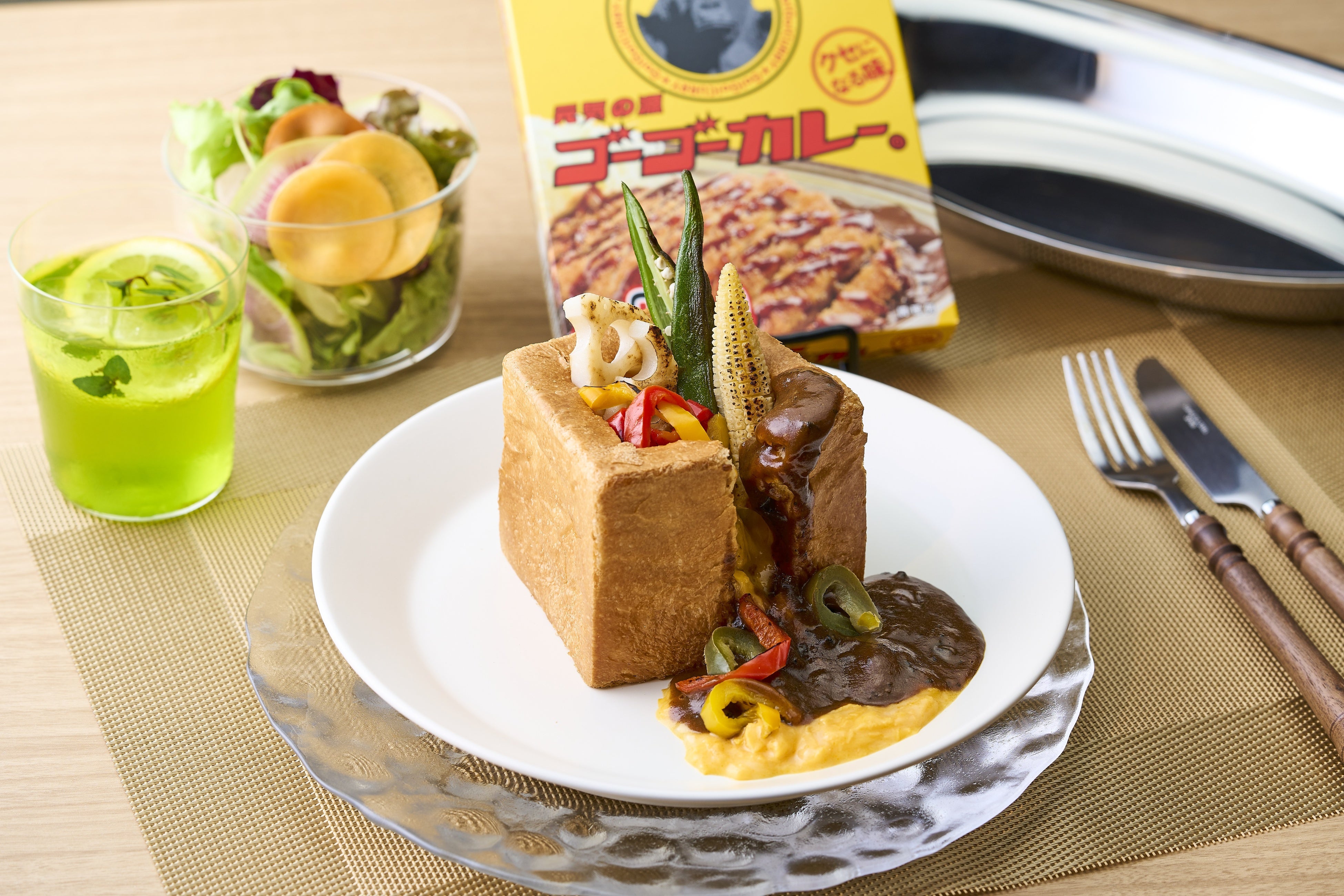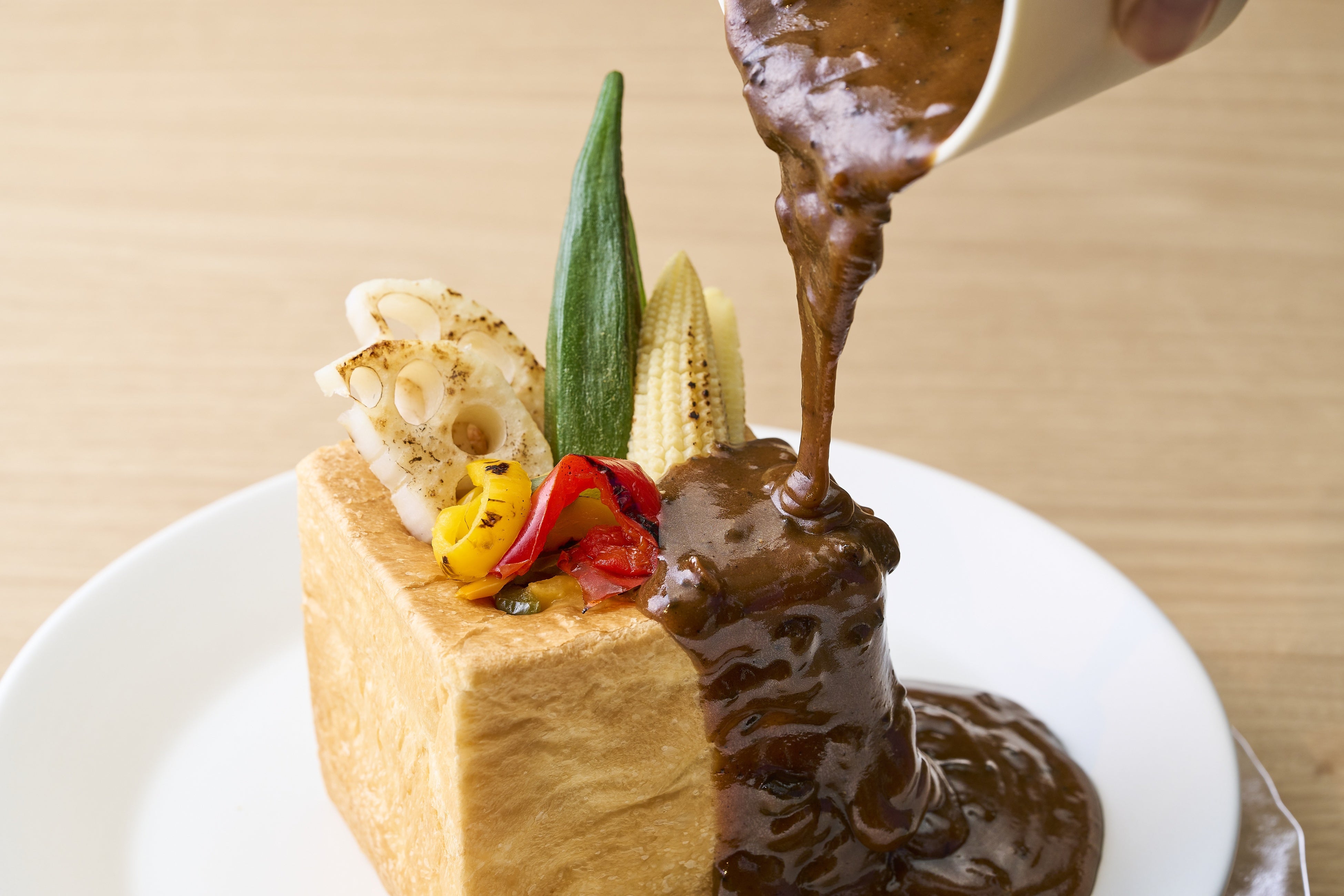 なめらかなスクランブルエッグとモッツァレラチーズを中に詰め、ヤングコーンやパプリカ、オクラのグリルをトッピングしたキューブ型のトーストに、カレーソースをかけて楽しみます。カレーソースには、ゴーゴーカレー特製の濃厚なカレールーを使っています。ゴーゴーカレーの特徴は、55の工程を5時間かけてじっくり煮込み、さらに55時間寝かせて旨みを熟成させていること。本メニューでは、その独特な香りと旨みをそのままに、優しい味わいにして仕上げました。洋朝食と言えば、パンとスクランブルエッグ。そこにたっぷりの野菜と、アクセントとしてスパイスのきいたカレーソースを加えることで、定番と新感覚を組み合わせます。金沢のソウルフードを味わいながら、朝からエナジーチャージできる朝食メニューです。