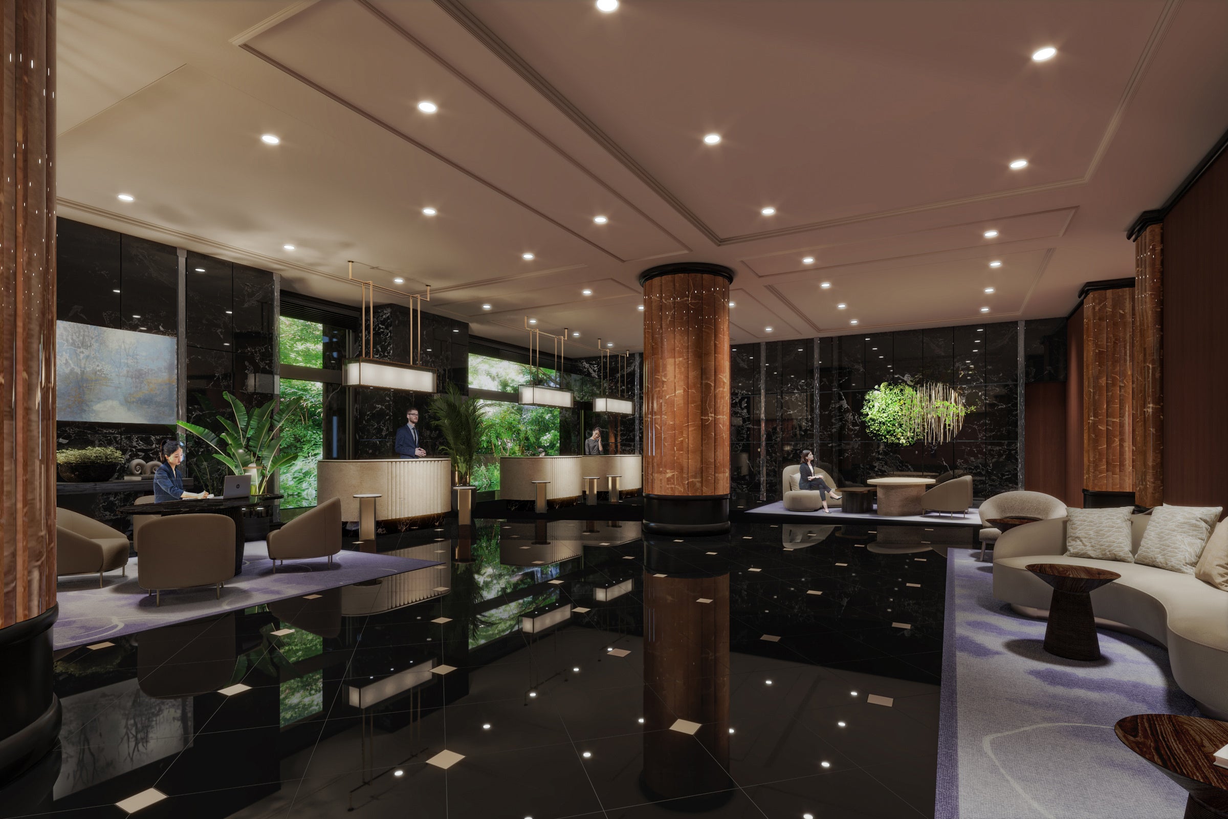 1階全体は西洋の室内温室「オランジュリー」をコンセプトに、ホテルを取り巻く美しい自然の景色と調和した空間としてシームレスに繋がるようデザインされました。大理石の柱の奥に位置するレセプションエリアは、フロントデスクのバックに設けた大きな窓が庭の緑を切り取り、グリーンウォールとなって、ゲストをお出迎えします。正面の壁に映えるフラワーアーティスト佐々木直喜氏によるグリーンインスタレーションとともに、自然の美しさ際立つ気品あふれる空間を演出します。
