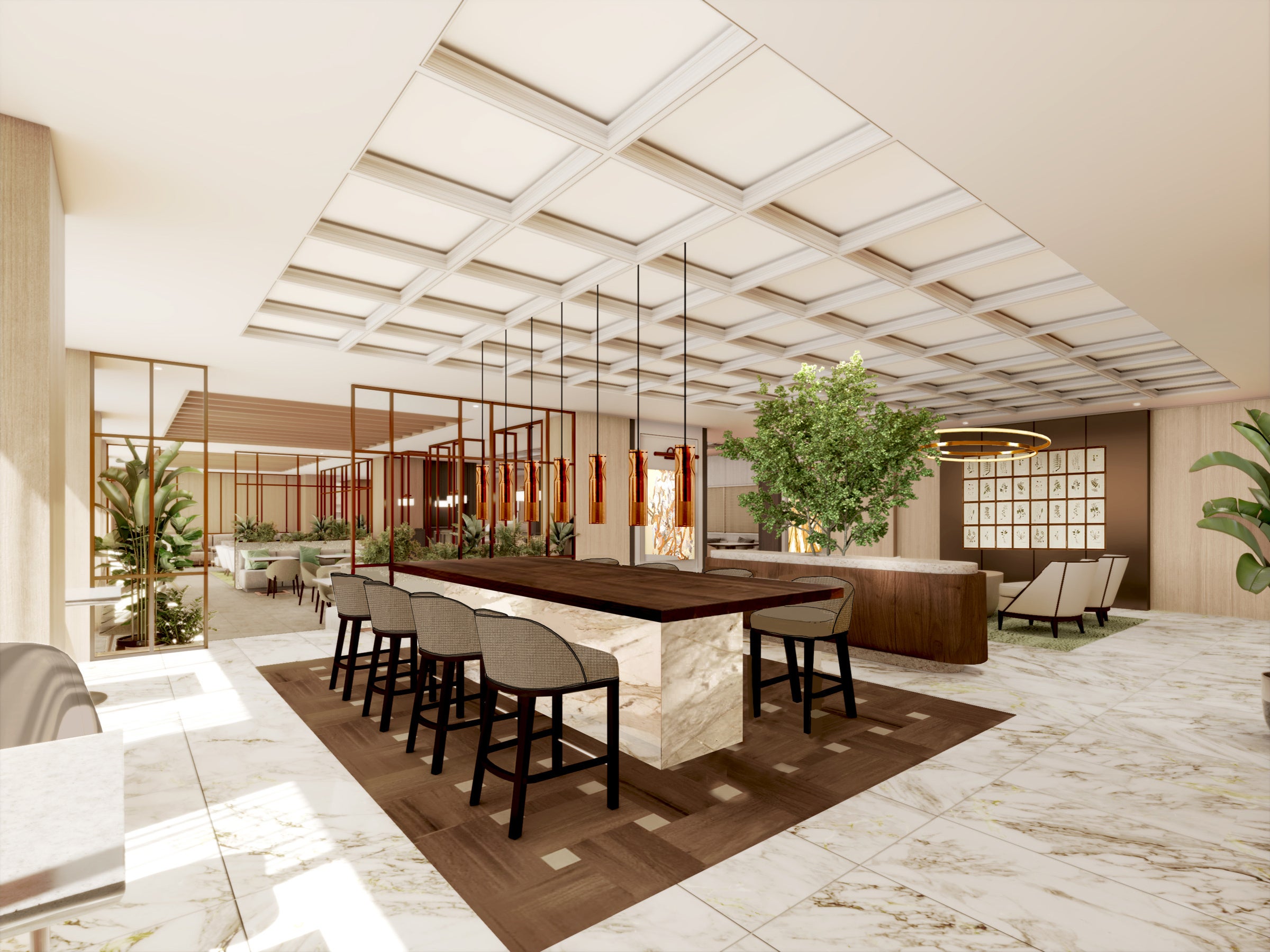 ホテルエントランスを入ると広がるのは、開業以来ウェスティンホテル東京を象徴する高さ約13mの壮大な大理石の柱に支えられた吹き抜けが印象的なロビー。重厚感あるオーセンティックな要素を残しながら、恵比寿の原風景からインスパイアされた自然のエレメントを美しく調和させたインテリアへとリニューアルしました。