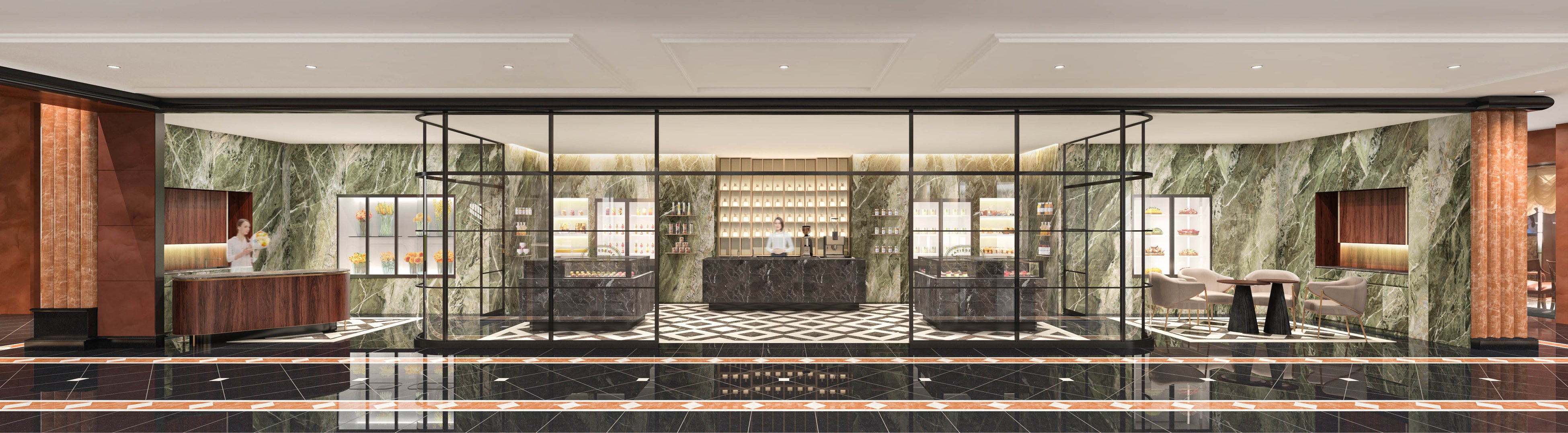 レストランに併設されていたペストリーブティックが、ガラスウォールとアイアンの格子に囲まれた室内温室のような空間とともに独立しました。ガラスのショーケースに並ぶホテルのエグゼクティブペステリ―シェフが巧緻をこらした季節を感じさせる美しいケーキやチョコレート、クッキーアソート、上質な素材を惜しみなく使用したフィナンシェなどの焼き菓子、ソルベの他、総料理長オリジナルカレーやスープなど、新しいブティックにふさわしい選び抜いた数々が揃います。また、フローリスト「+F」を新しく併設。季節を感じる洗練された花々は、ブーケのほか1本からご購入いただけます。