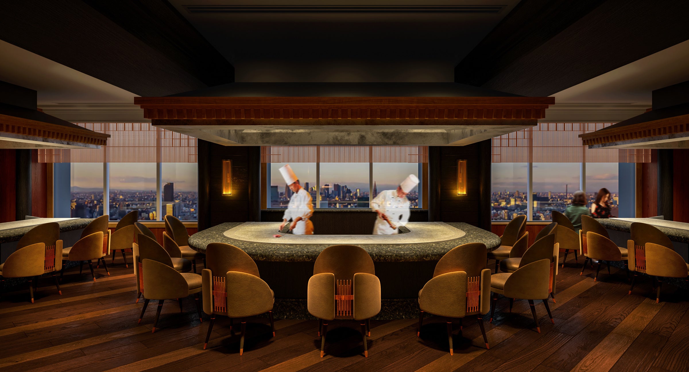 ウェスティンホテル東京の最上階から東京の夜景や晴れた日には世界遺産の富士山も望めることができる鉄板焼レストラン「恵比寿」。立ち上る炎をコンセプトにデザインされた壁のライトが照らす落ち着いた空間の中、職人の熟練した技術を駆使して自然が生み出す最高の食材を焼き上げます。