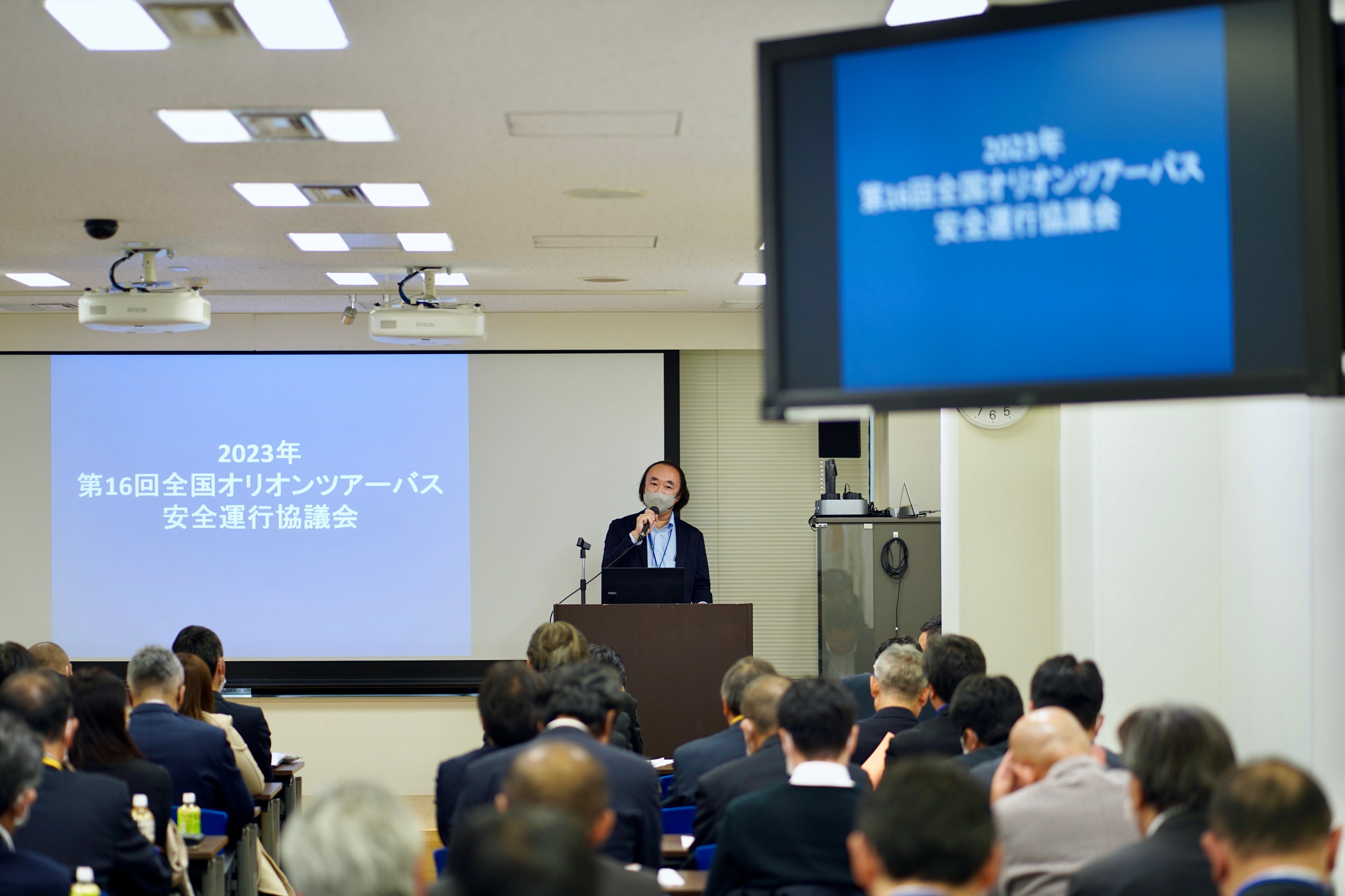 2023-2024のウインターシーズンも、関東、東海、関西、中国、九州の各エリアを出発する多彩なスキー&スノーボードツアーを企画。 「オリオンツアーバス安全運行協議会」は、ツアーバス事業における安全運行のさらなる強化および有事の際などに迅速な対応ができる組織づくりを目的に、オリオンツアーの企画実施会社である当社と運行バス会社で定期的に開催している情報共有の場です。16回目の開催となる今回は、全国65社74名のバス事業者が会場に集まりました。冒頭の開会挨拶では当社・第二事業部の岩橋が「新型コロナウイルスも5類に移行し、お客様の動きは戻りつつある一方、節々でバスが絡む大きな事故も耳にします。我々はバス会社様と一丸となり、より一層安全な運行を進めていただきたい」と語り、安全第一かつ快適なツアー運行への認識強化を呼びかけました。