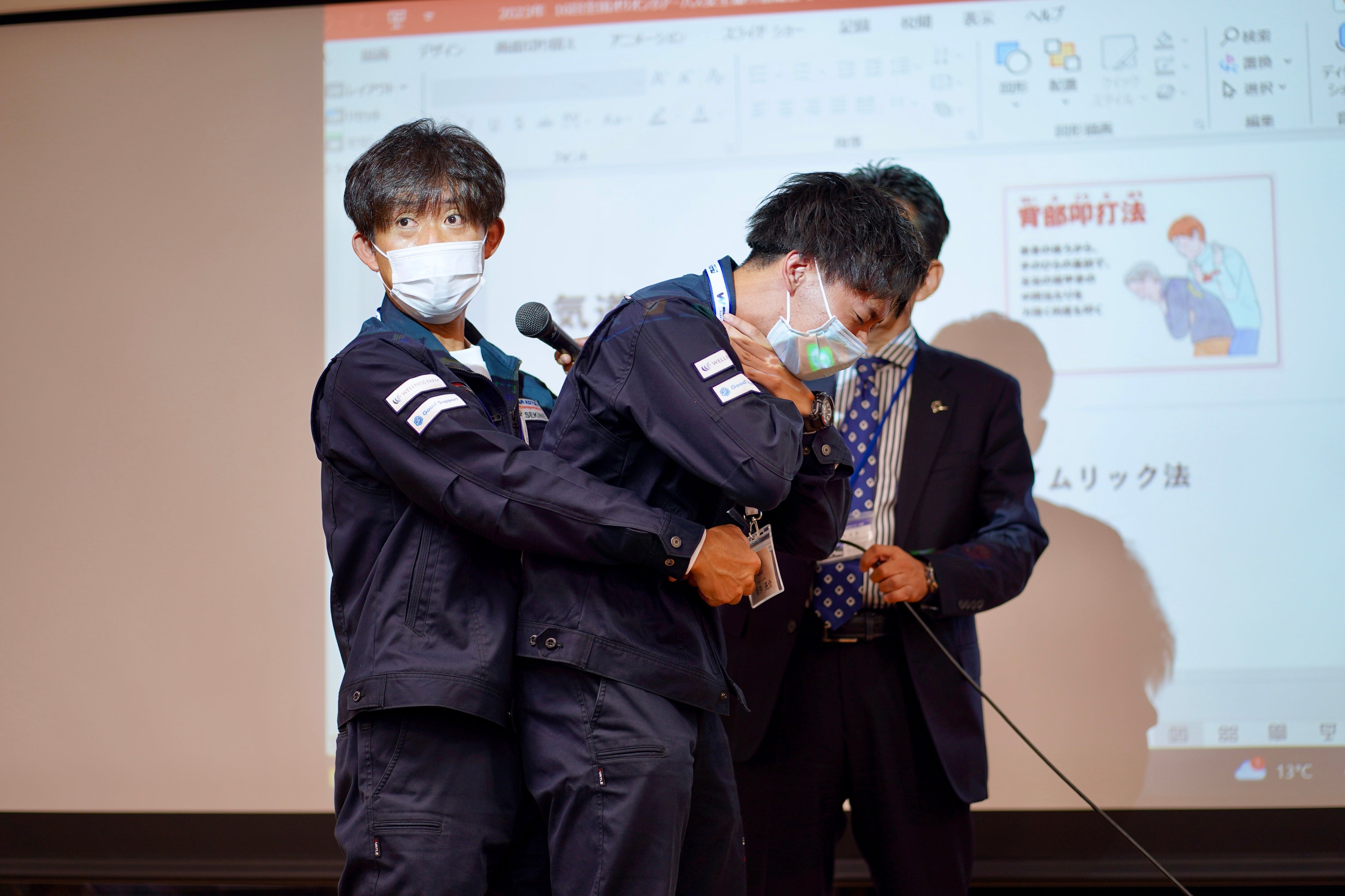 AEDの取り扱いや心配蘇生法の実演では、全参加者が真剣に見つめるなか、会場は実際の現場さながらの緊迫感に包まれ、有事の際の迅速な対応方法を確認しました。