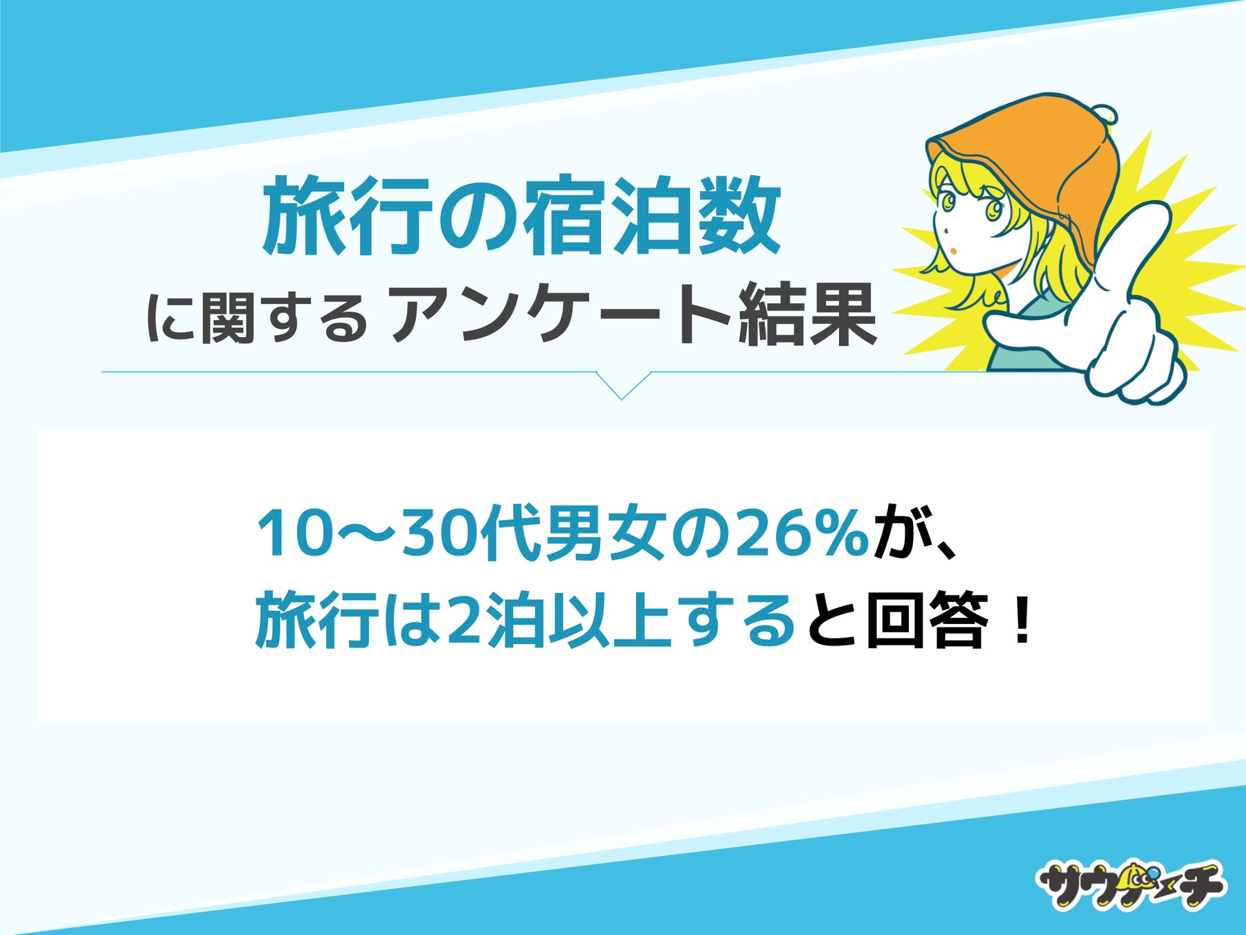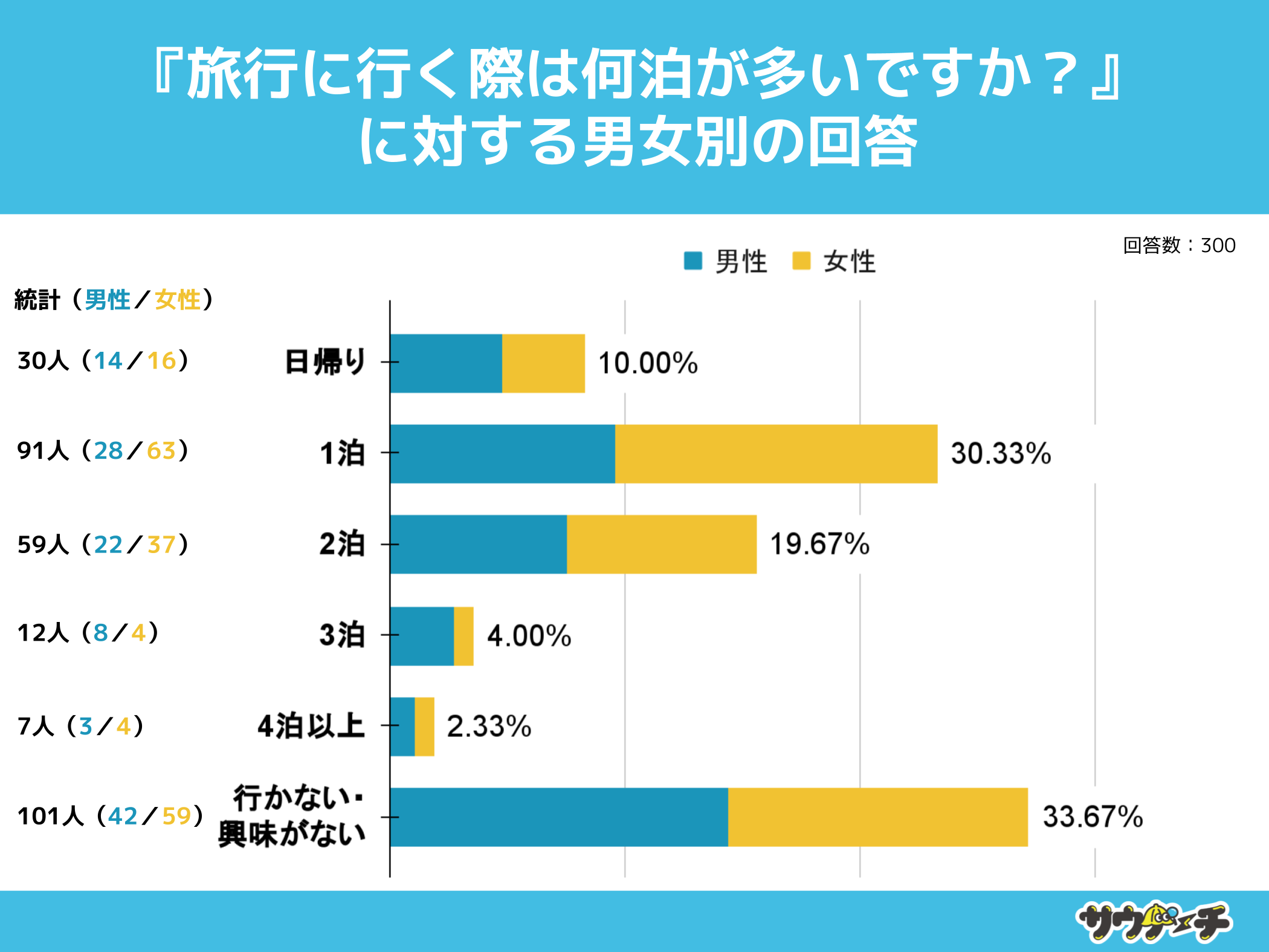 10代〜30代男女を対象とした『旅行に行く際は何泊が多いですか?』というアンケートで、最も多かった回答は「行かない・興味がない」で33.67%でした。