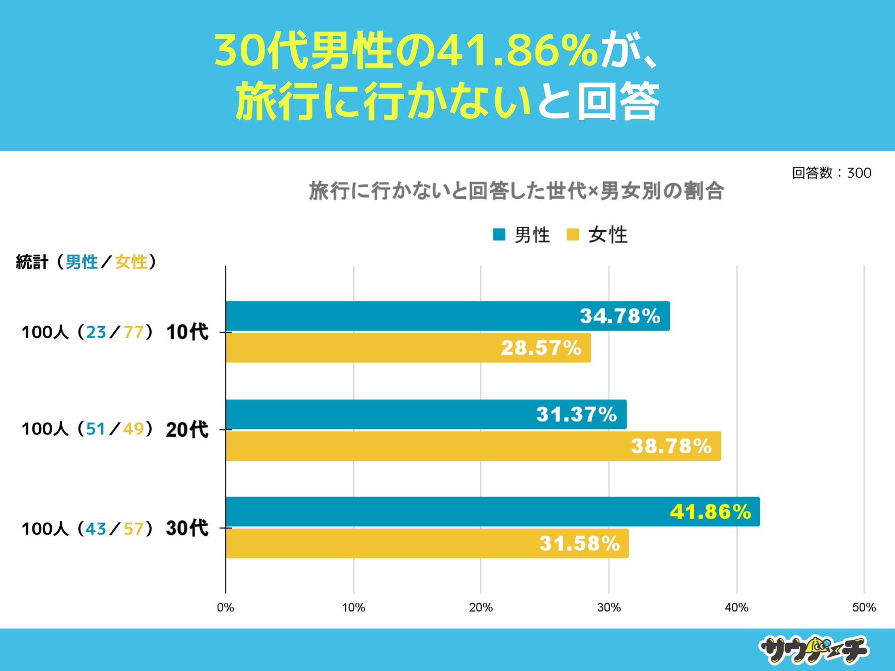 旅行に行かないと回答した割合を世代×男女別でみてみますと、30代男性の41.86%が最も高く、次いで20代女性の38.78%、10代男性が34.78%で、30代男性の4割以上が旅行に行かないことがわかりました。
