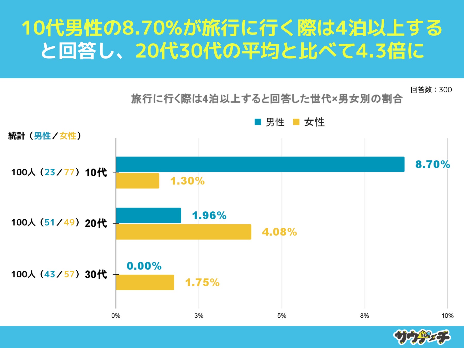 【10代男性の8.70%が旅行に行く際は4泊以上すると回答し、20代30代の平均と比べて4.3倍に】