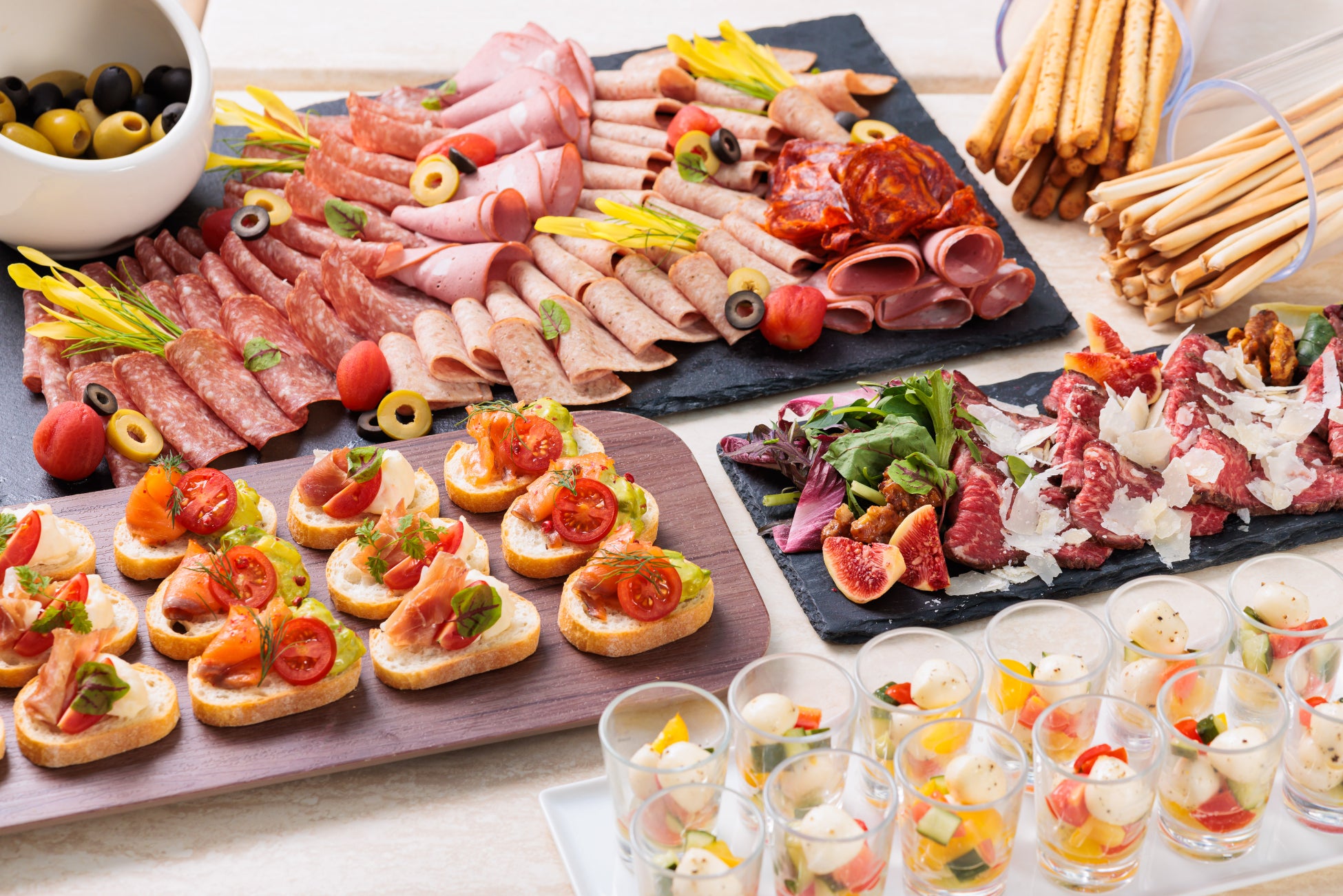 イタリアの前菜やハムなどを集めたコーナーが登場します。シェフのおすすめは「ブルスケッタ」。ニンニクの香りを付けて焼いたパンに、お好みの具材をのせて食べるイタリア料理の前菜。TERRACE & DINING SORAでは「生ハムとポテトサラダ」「スモークサーモンとアボカド」2種類の具材をご準備しております。お好みの具材をパンにのせてオリジナルのブルスケッタをお召し上がりください。
