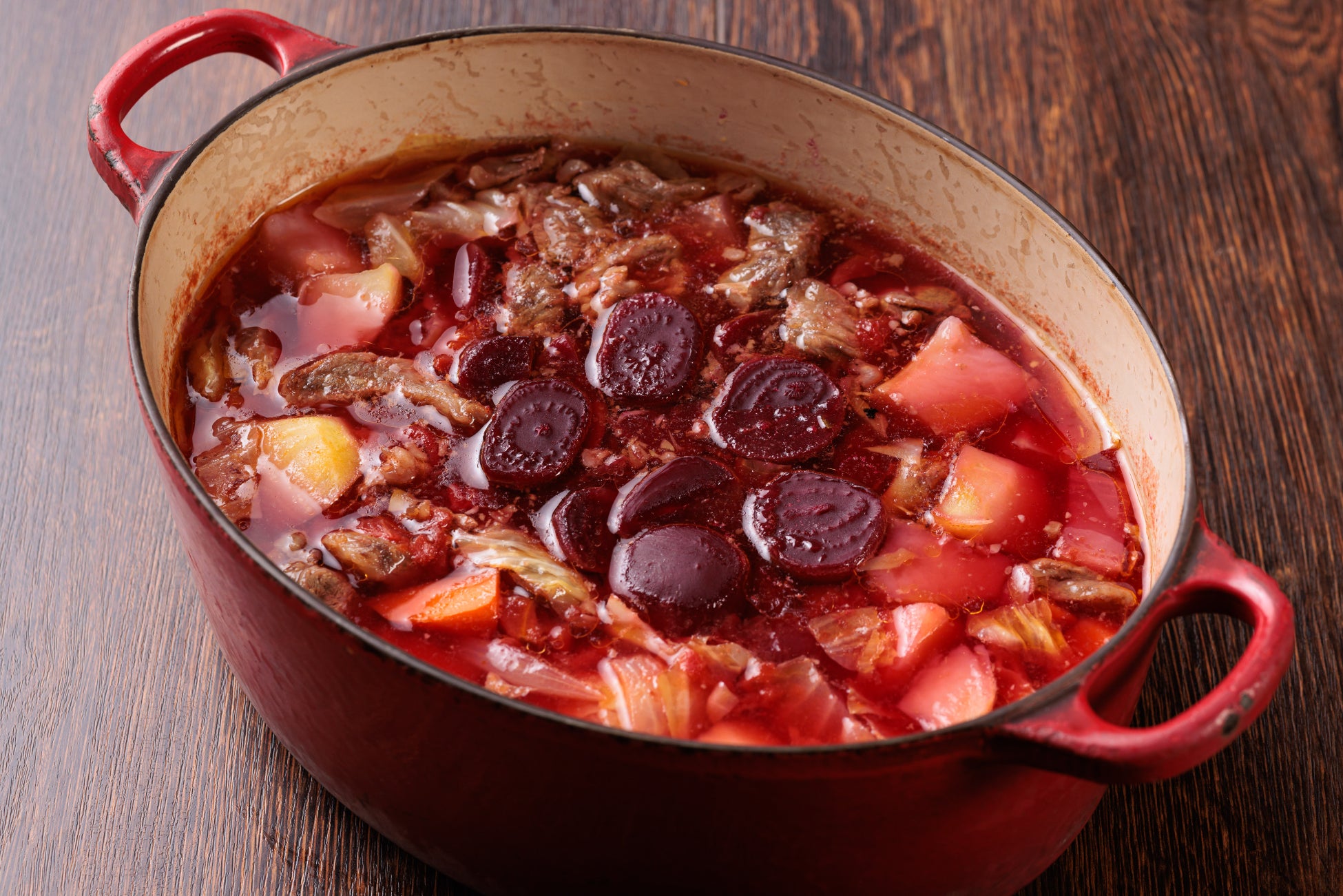日本でいうお味噌汁のような存在で、赤い色が特徴的なスープ料理。ビーツや牛肉などを野菜と合わせて煮込み、酸味が特徴的な味わいとなっています。