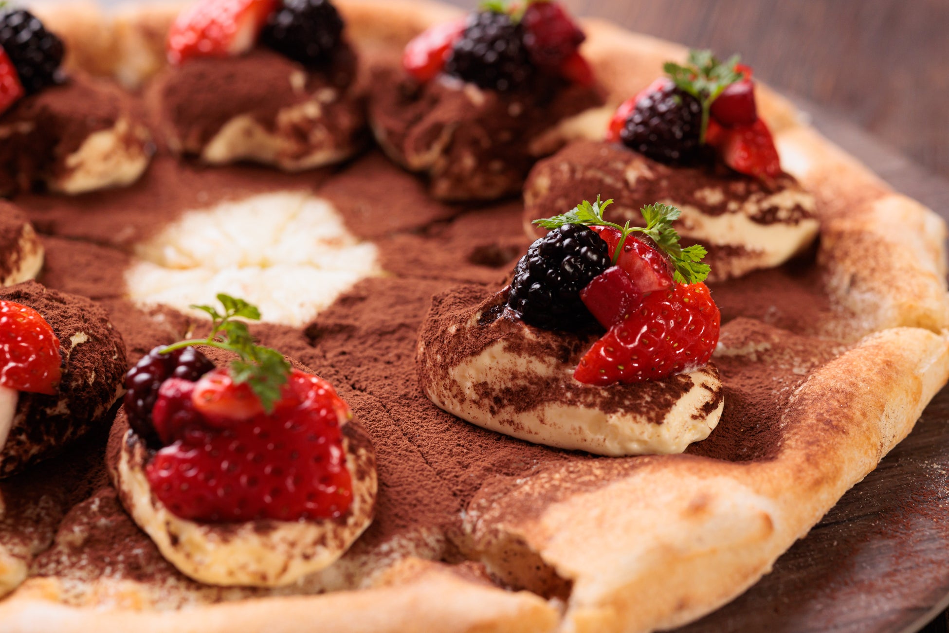 シーダパレスの象徴である石窯焼きのピッツァ。冬は、イチゴとマスカルポーネのデザートピッツァをご提供します。甘酸っぱいイチゴと、なめらかなクリームのように仕立てたマスカルポーネにココアパウダーをまぶした、ティラミスをイメージしたデザートピッツァです。