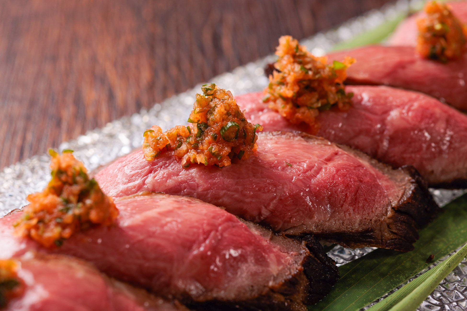 イギリスでは、日曜日のランチのメインディッシュとして扱われているローストビーフを握り寿司にアレンジしました。もみじおろしを添えてお楽しみください。