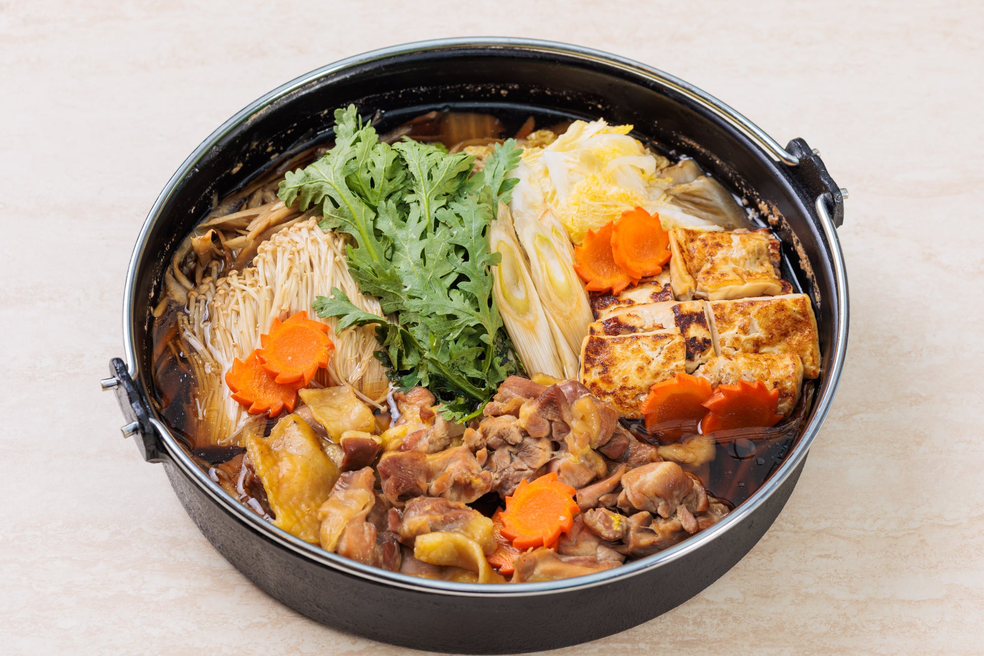 牛肉ではなく、大分県産の冠地どりをすき焼き風に味付けしたすき煮鍋。馴染み深い味付けに冠地どりの食感をお楽しみください。