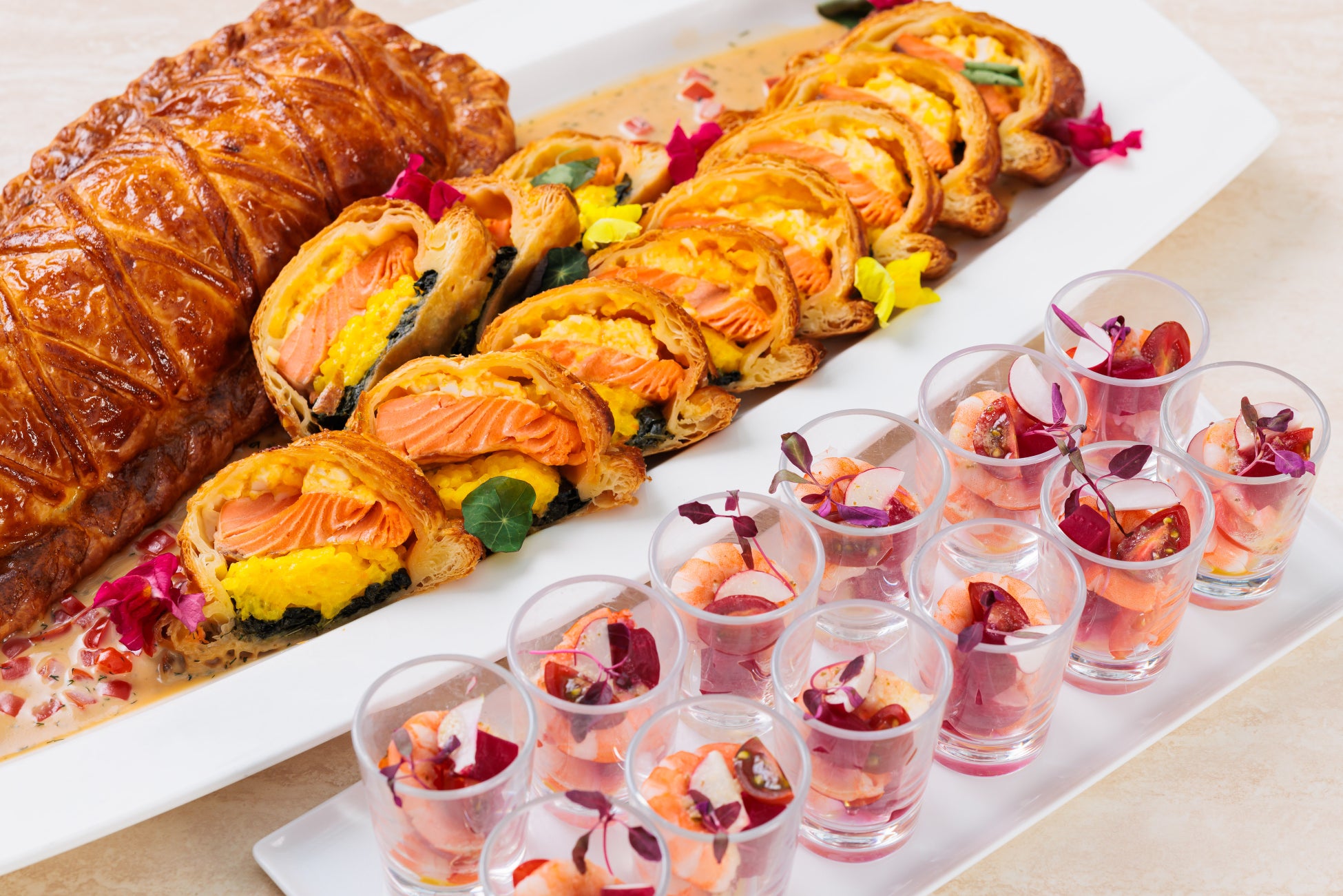環境と社会への影響を最小限に抑えたASC認証を取得した養殖場で育てられた水産物を使用した「海老と赤い野菜のサラダ」、「サーモントラウトのパイ包み焼き」が登場します。サーモントラウトをパイ生地で包み、外はサクッと中はしっとりに旨味を閉じ込めて焼き上げています。食材と相性の良い白ワインソースでコースの一品のような料理がビュッフェにてお楽しみいただけます。
