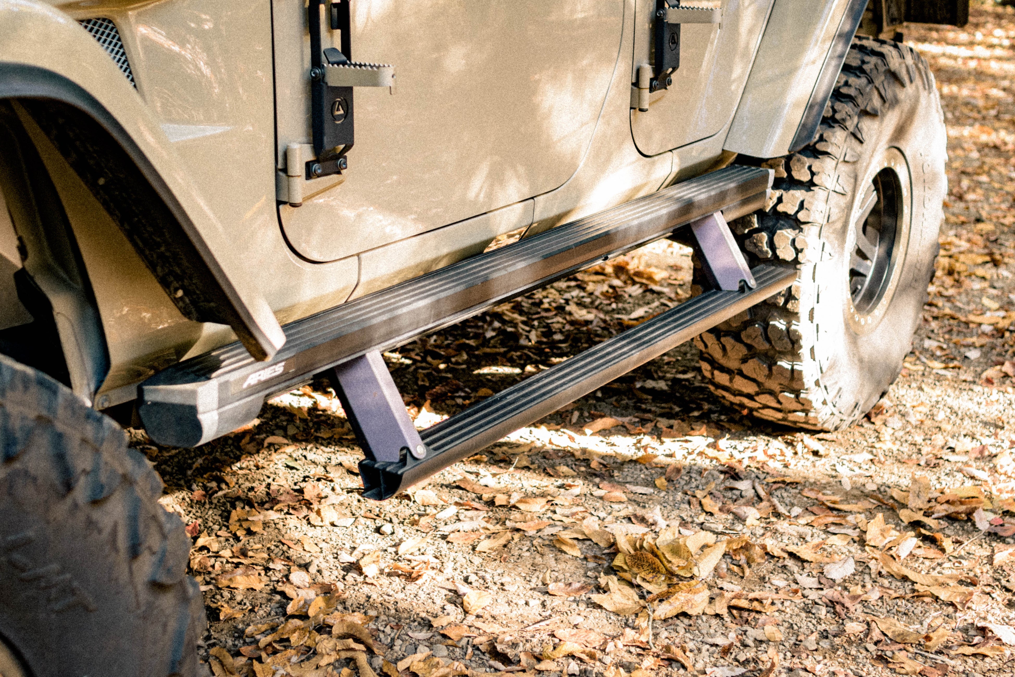 足回りのカスタムにより非常に車高が高いJKラングラーですが、パワーステップにより乗り降りも快適。スイッチ一つで上げ下げが可能です。