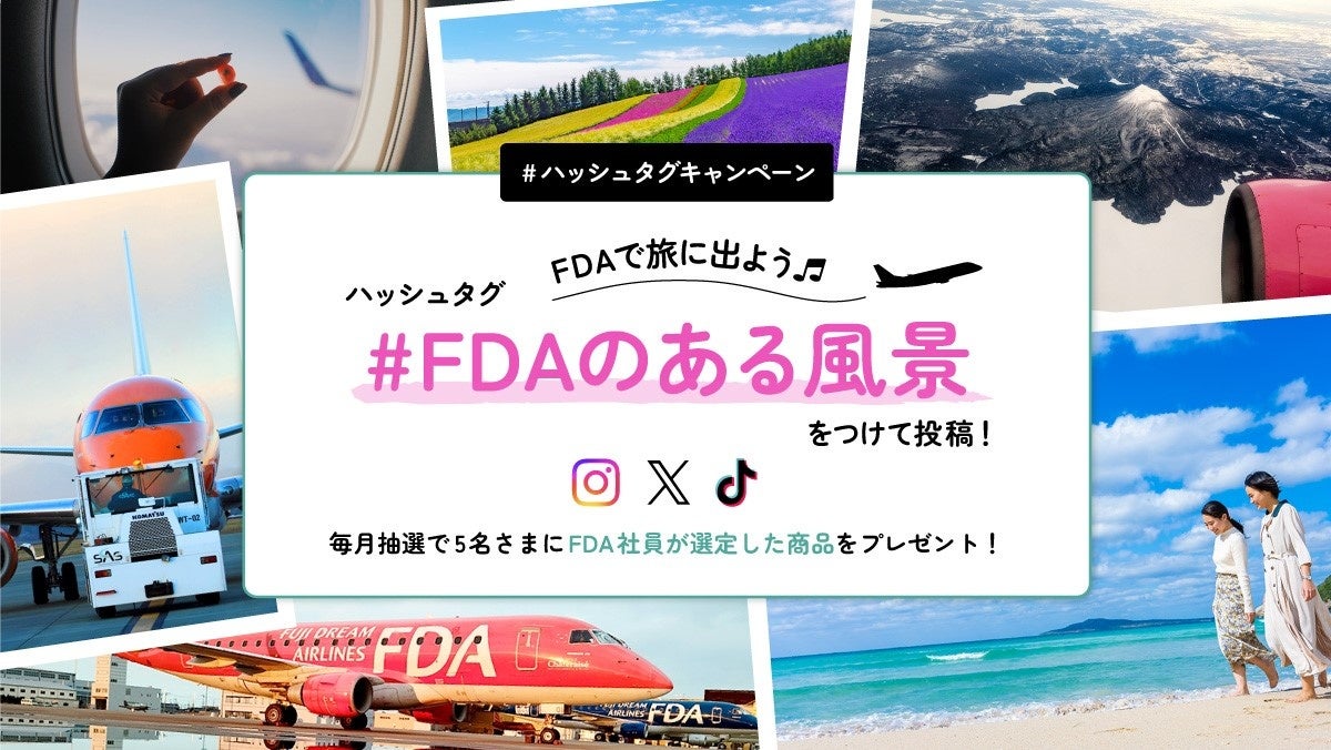 株式会社フジドリームエアラインズ(略称:FDA、本社:静岡県静岡市、代表取締役社長:楠瀬 俊一)は、FDA公式Instagram・X(旧Twitter)・TikTokの各アカウントにおいて、FDAの機体やFDAをご利用いただいた旅行の様子など、ご自身で撮影されたFDAに関する写真に『#FDAのある風景』の専用ハッシュタグを付けて投稿いただくキャンペーンを開始いたします。