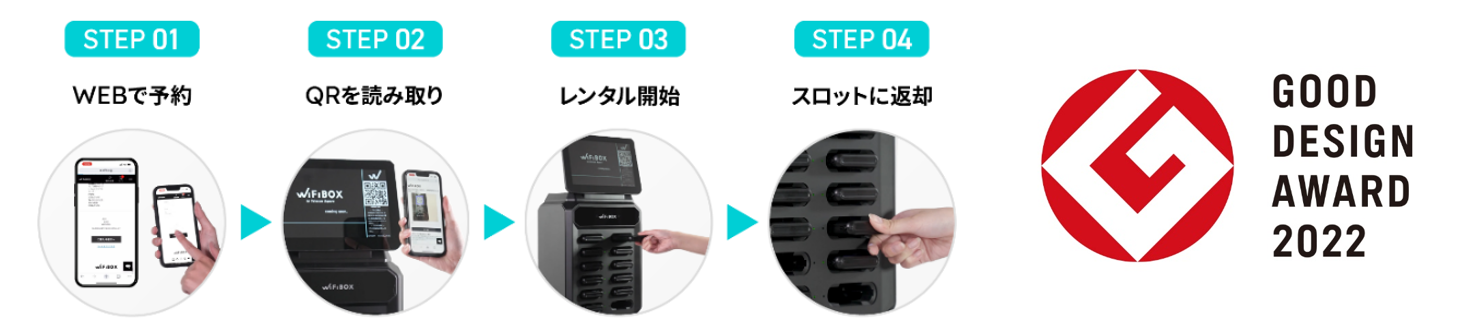 「WiFiBOX」は、当社が2022年4月1日にリリースしたWi-Fiレンタルの新サービスで、事前予約がなくとも即時予約・受取・使用開始が可能なシェアリング型サービスです(特許出願中)。日本国内プランは1日840円(税込価格)で無制限の利用ができるうえ、端末には充電用ケーブルが格納されモバイルバッテリー機能も搭載、スマートフォンの充電を行うことも可能です。コロナ禍での非対面ニーズへの対応やユーザーにとって煩わしい手続き・行列待ちの排除、運営コストの削減、設置場所の余剰スペース確保など多方面での複合的効果をもたらすサービスデザインが高く評価されたことから、2022年度グッドデザイン賞を受賞いたしました。