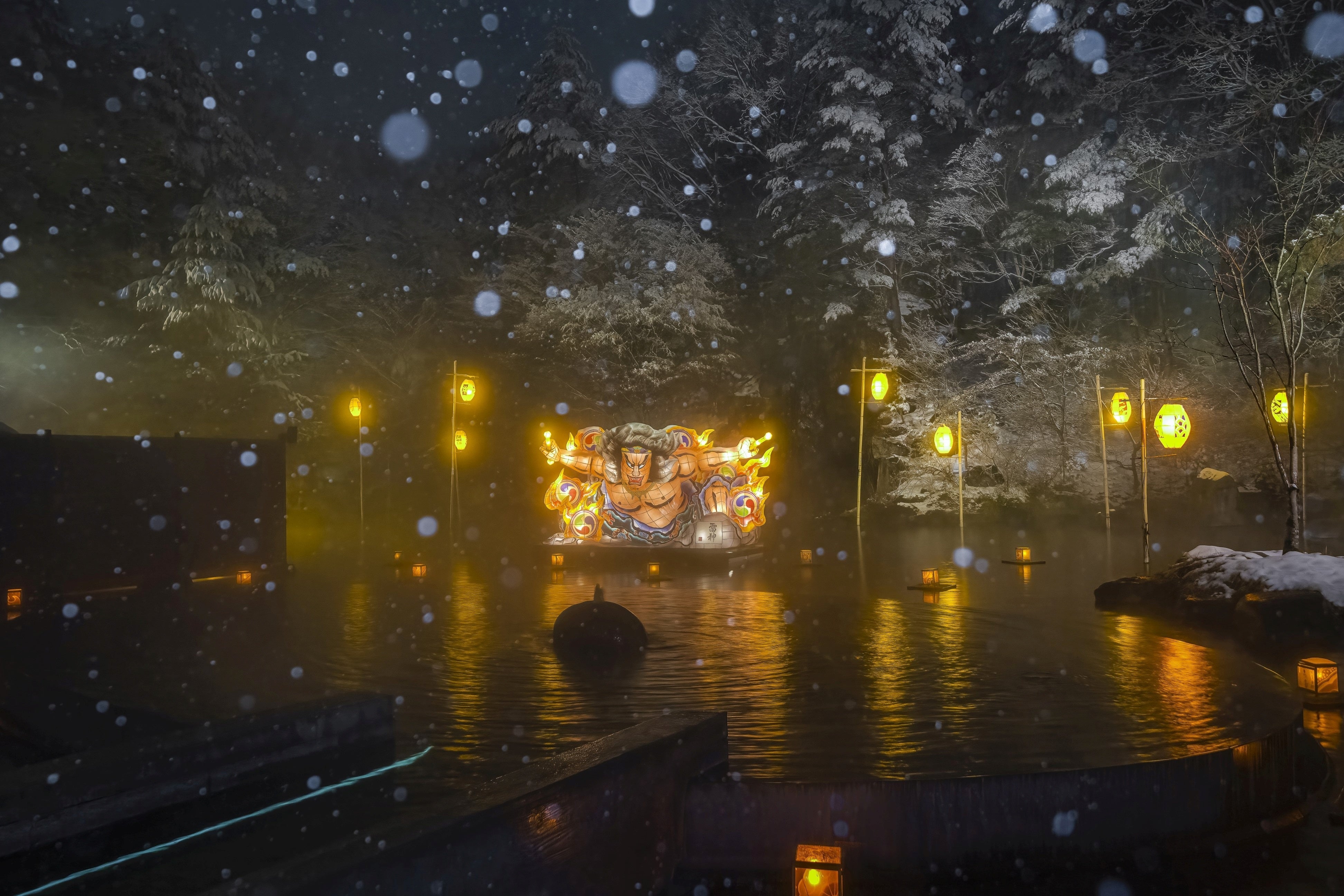 冬に体験できるのは、絶景雪見露天風呂「ねぶり流し灯篭」です。開放感あふれる露天風呂「浮湯(うきゆ)」で、とろりとした肌触りの温泉に浸かりながら、ねぶたと雪景色が織りなす幻想的な景色を眺められます。脈々と受け継がれてきた祭りに思いをはせながら湯浴みができます。