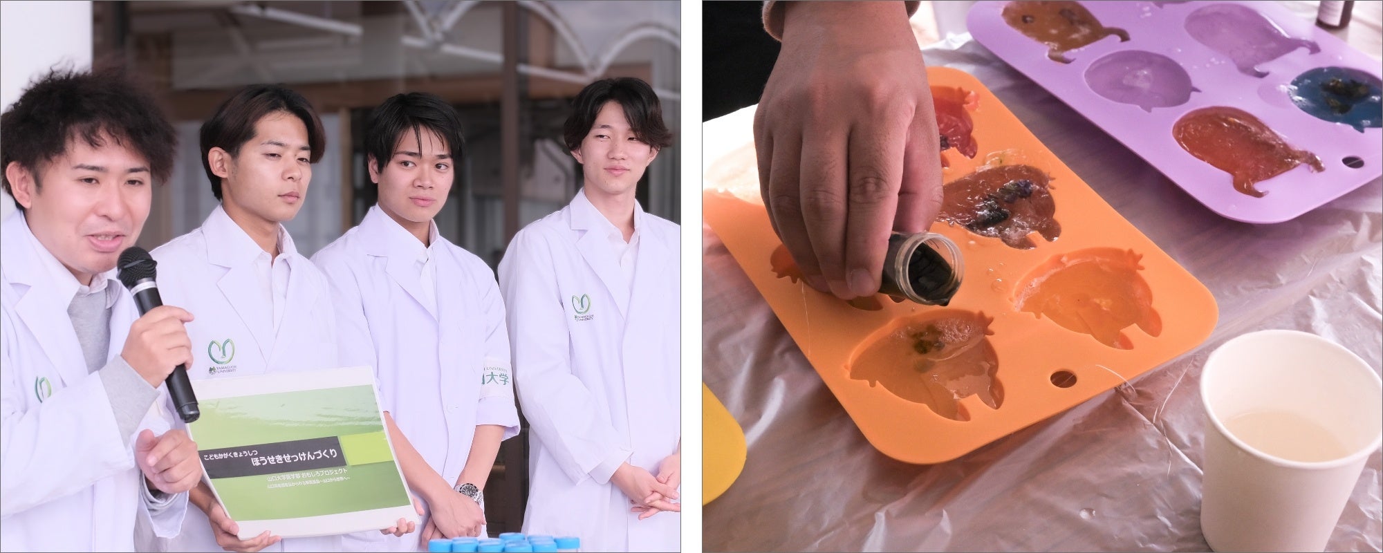 また、山口大学おもしろプロジェクトの学生さんによる「小野茶石けん教室」も開催され、手洗いの大切さと石けんが汚れを落とすメカニズムについて紹介の後、参加者様には実際に石けん作りを体験していただきました。
