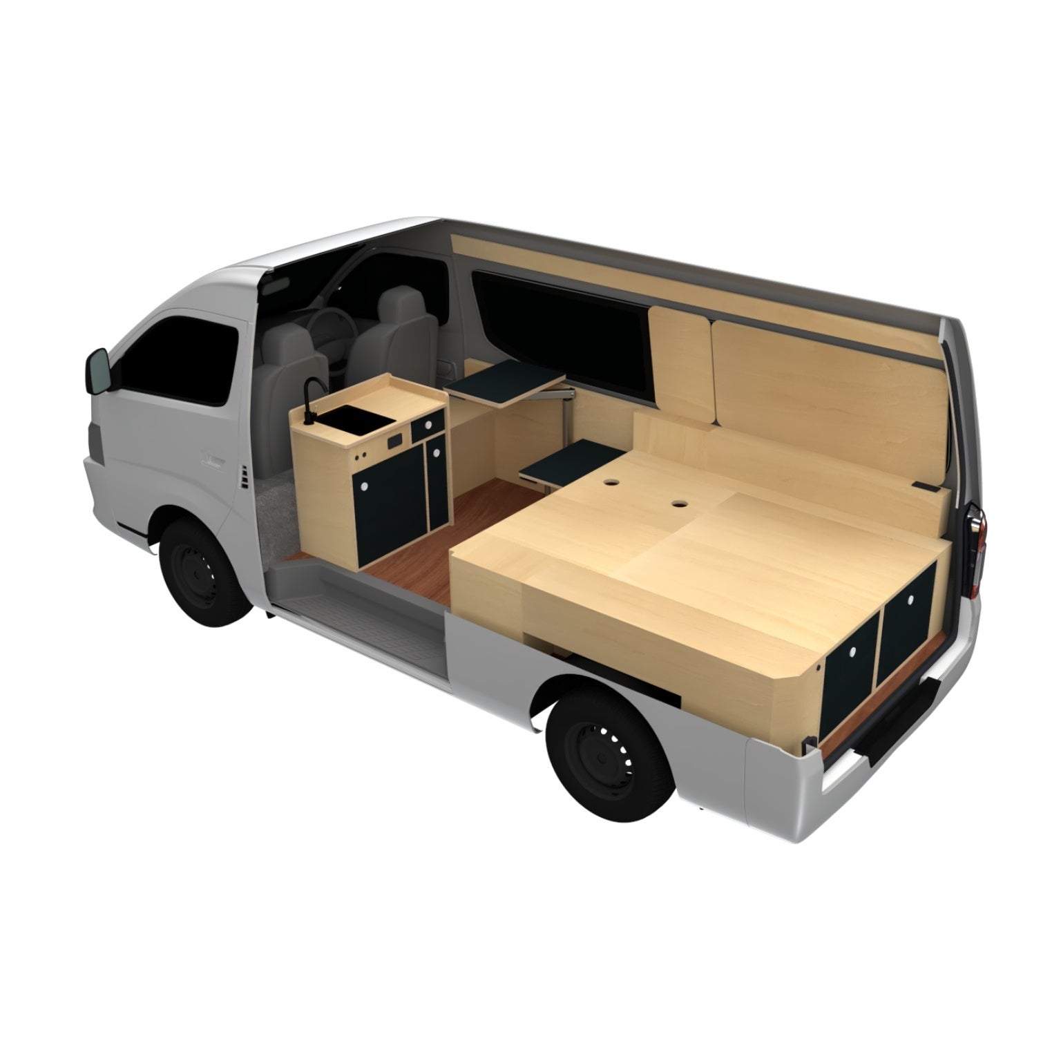 NICOは、2人またはソロのトラベラー向けの走る1DKキャンピングカーです。自分らしい空間をデザインできる一台を探されている方におすすめです。カーテンで空間を切り分けることで、一人の時間も確保できる機能を備えたキャンピングカーです。居住スペースを自由にカスタマイズできる点とNV350が持つ走行時の乗り心地は、NICOでの旅の快適性を高めます。