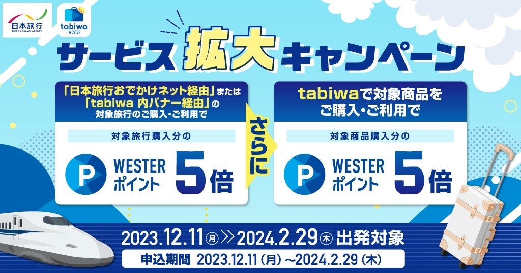 現在、「JRおでかけネット」及び「tabiwa」内の日本旅行ページ経由で『JR+宿泊セットプラン』にお申込みいただいた場合にWESTERポイントが貯まるサービスを実施しています。この度、新たに『宿泊プラン』でもポイントサービスの対象プランを拡大します。