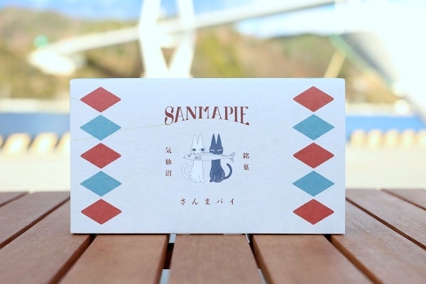 パッケージには、道端でトラックの荷台から落ちた大ぶりなサンマを咥えたネコのイラストが描かれています。サンマの大漁に沸いた昔の気仙沼をイメージしました。さんまパイが東北を代表する銘菓に成長することで、サンマの水揚げに賑わった頃の活気を取り戻したいと願いを込めました。「先代が抱いた思いを引き継ぎ、宮城東北を代表する菓子として発信していきたい。素材にこだわった新しいさんまパイの美味しさを味わっていただきたい。」(5代目小山裕隆)