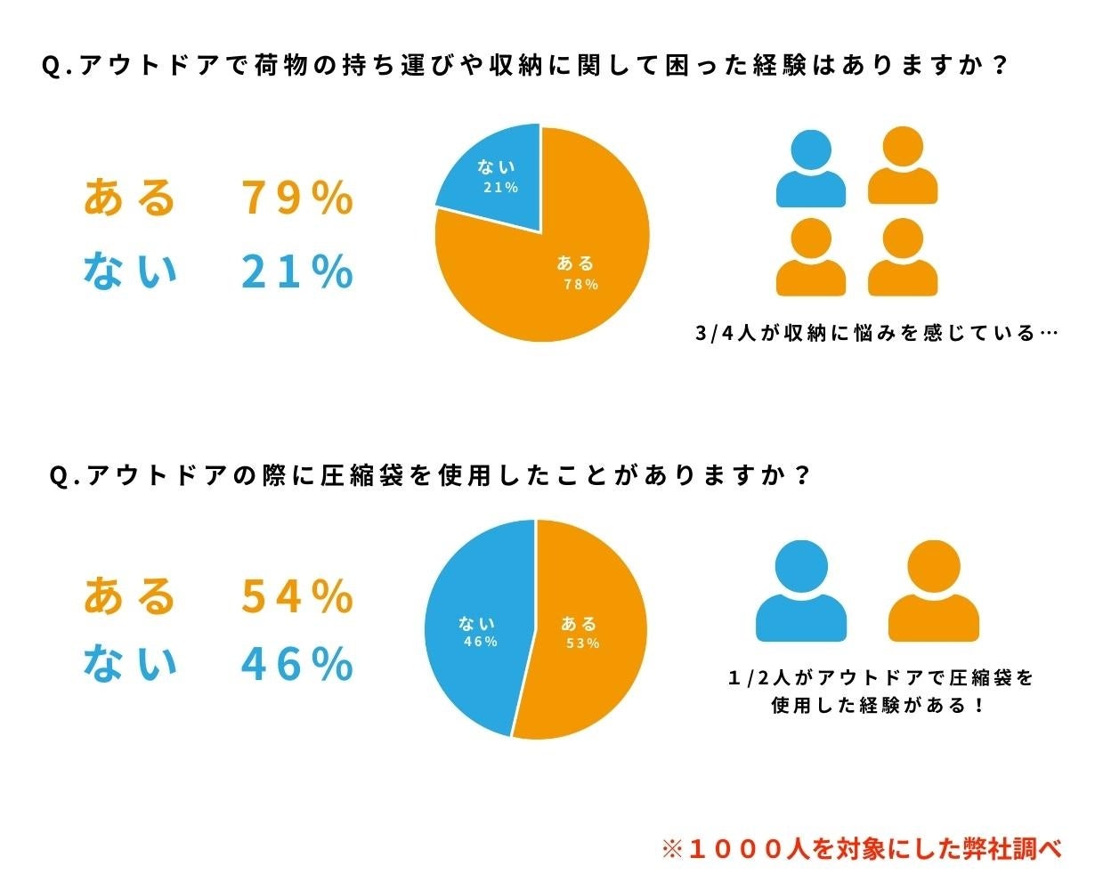 キャンプや登山などのアウトドアをする7割が荷造りに悩みを抱えており、さらに5割が家庭用の圧縮袋を屋外で使用しています。弊社独自調査により、半数以上のアウトドア愛好家が何らかの形で荷物の収納や持ち運びを課題に感じていることが浮き彫りになりました。