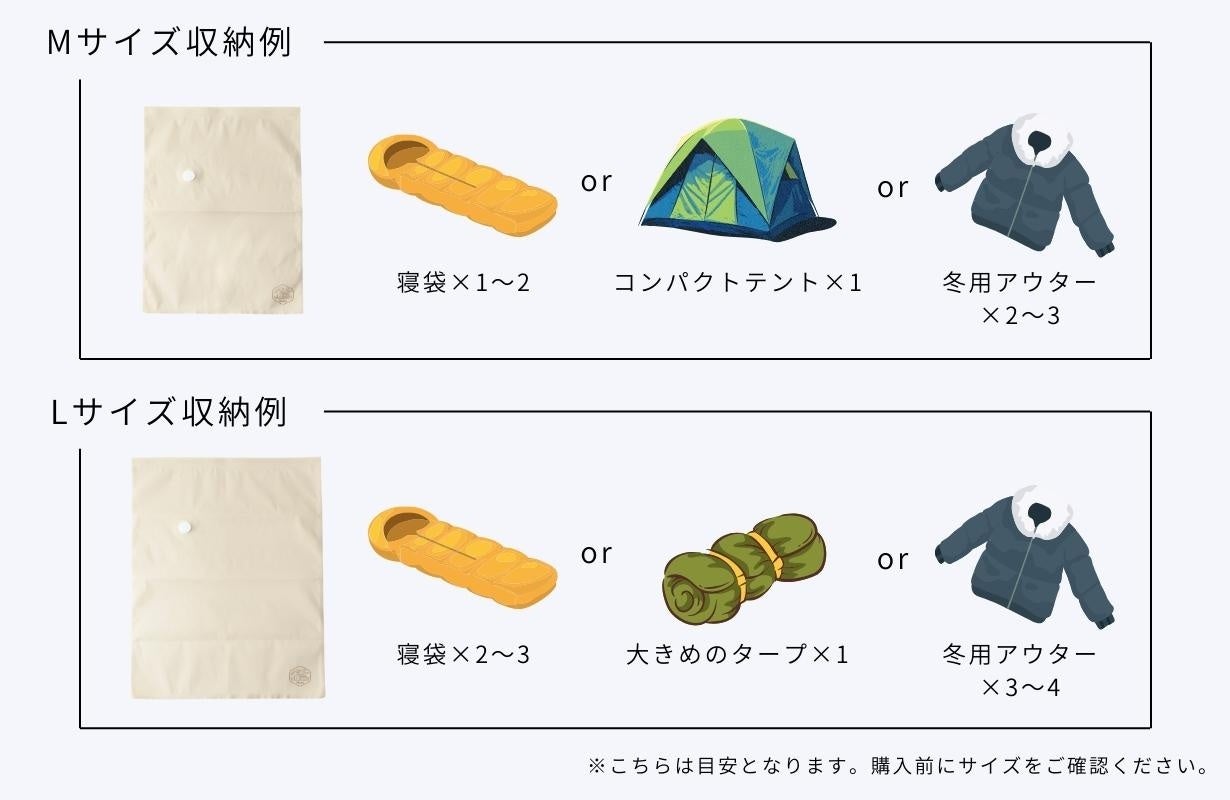 キャンパーだけでなく、アウトドアの荷造りに悩みを抱えるすべての人が使用することを想定して作られています。登山や自転車、ハイキング、ツーリングなど幅広いシーンで活用いただけます。袋に衣類などの荷物を入れて圧縮することで、元の半分以下のサイズまでコンパクトになります。