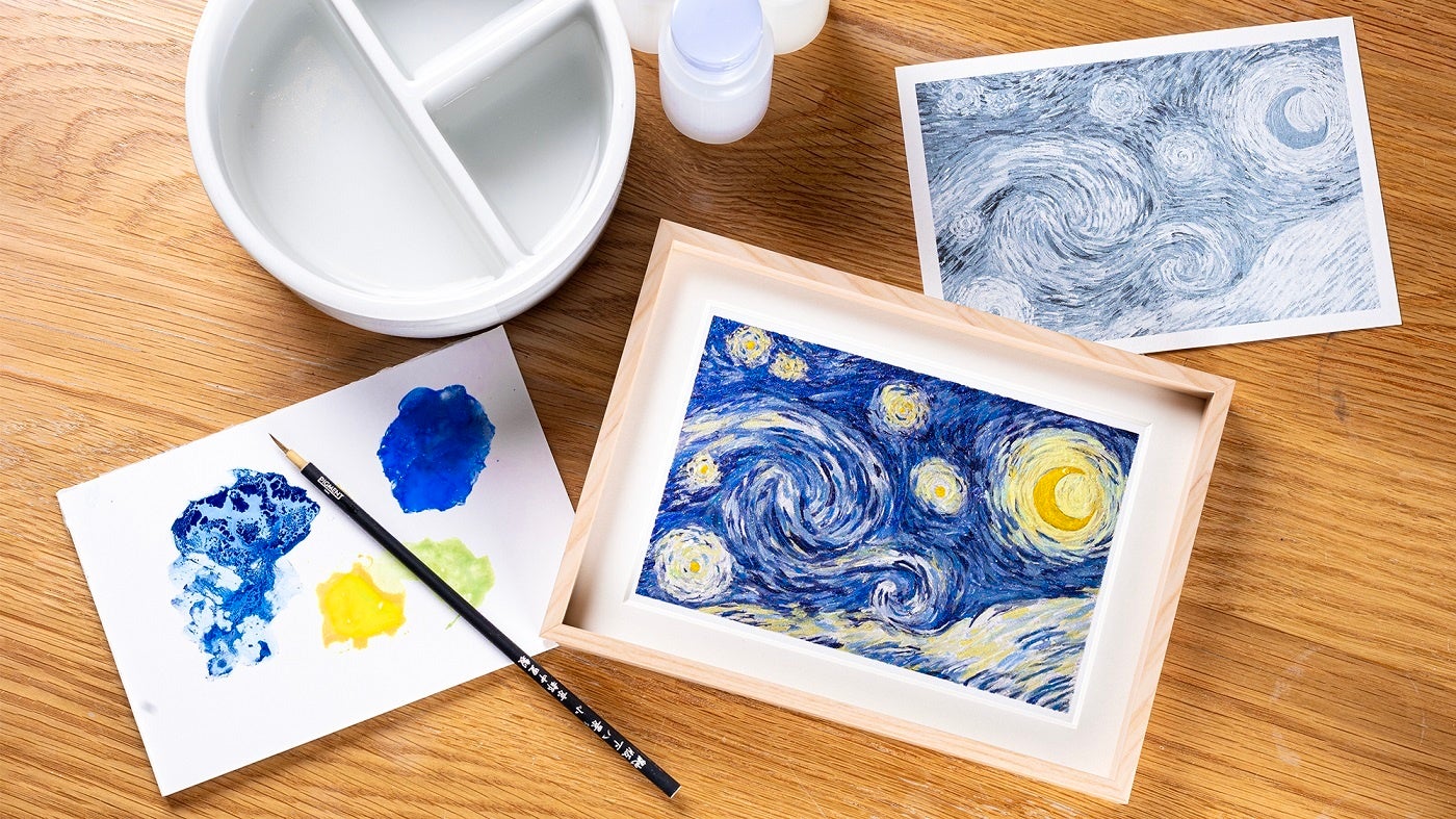 「ゴッホ・アライブ」は、映像という光を通して絵画を見る展覧会であり、テクノロジーの力でゴッホのイメージが拡がる感覚は他では得られない体験価値があります。本ワークショップでは本展ならではのエッセンスを取り入れ、ゴッホの代表作「星月夜」の一部を模写します。モノトーンの下図がプリントされた台紙の上に、光を受けてキラキラと輝くエフェクト顔料を使用したアクリル絵具を直接のせていきながら、自分だけのオリジナルの作品を制作します。出来上がった作品は額に入れてお持ち帰りいただけます。渦巻く夜空を細筆で丁寧になぞることで、ゴッホが巡らせた思考の軌跡を追体験できます。