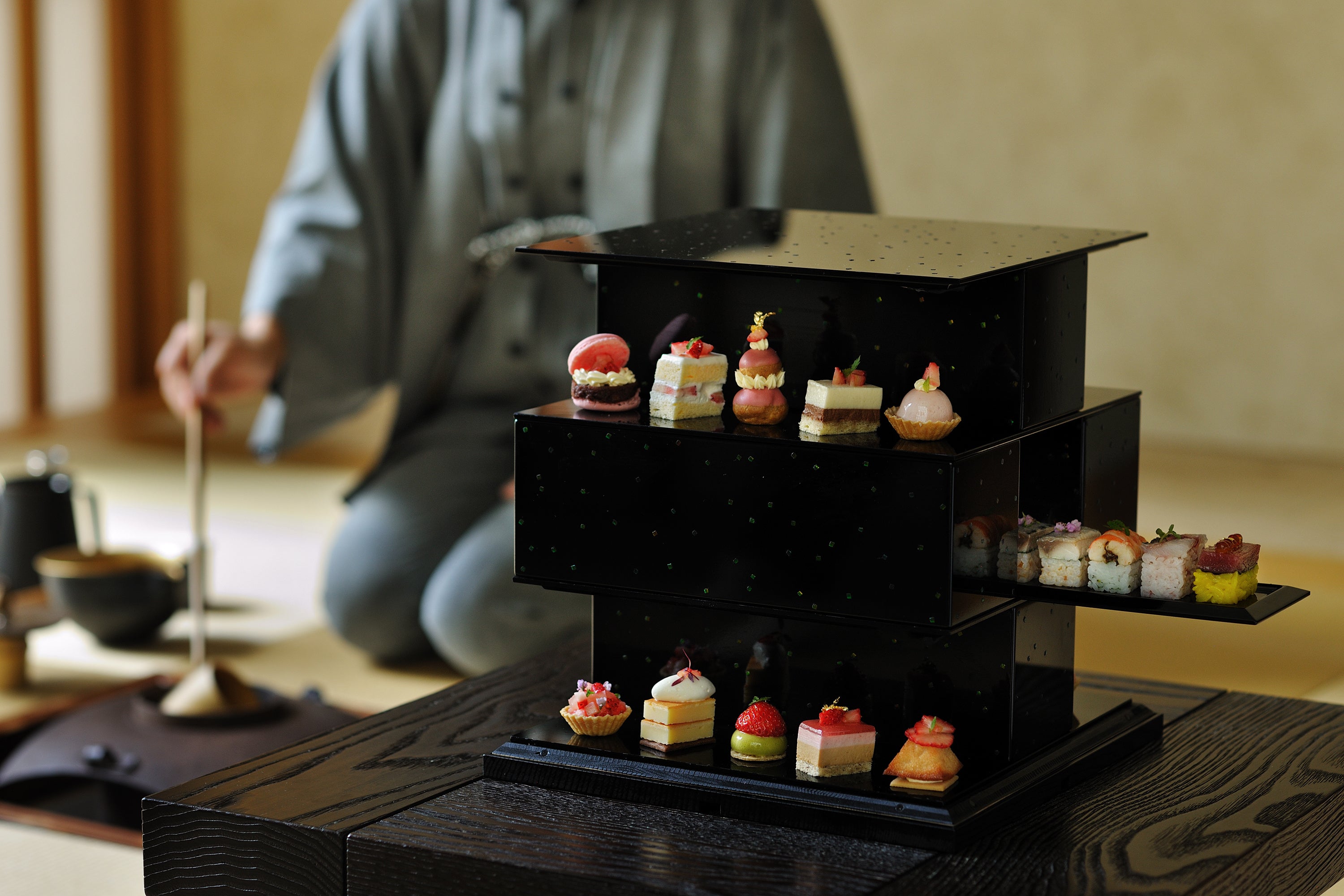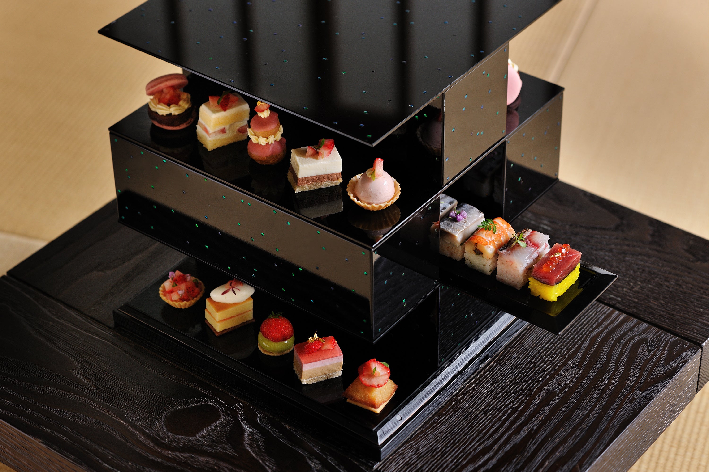濃茶の菓子器には、古くから縁高(ふちだか)のお重が使われてきました。本アフタヌーンティーでは、玉虫細工を施したオリジナルの重箱で提供します。漆塗りのお重には、1mm四方にカットされた玉虫の羽が散りばめられ、目を奪われるほどの輝きを放ちます。玉虫細工は、古代の日本建築を知る上で重要な遺品である法隆寺の玉虫厨子((たまむしのずし)にも使われ、推古天皇の御物(ぎょぶつ)と言われてきました。(*2)約1300年もの時を越えて人々を魅了する玉虫の羽をあしらったこだわりの重箱を前に、優雅なひとときを過ごせます。