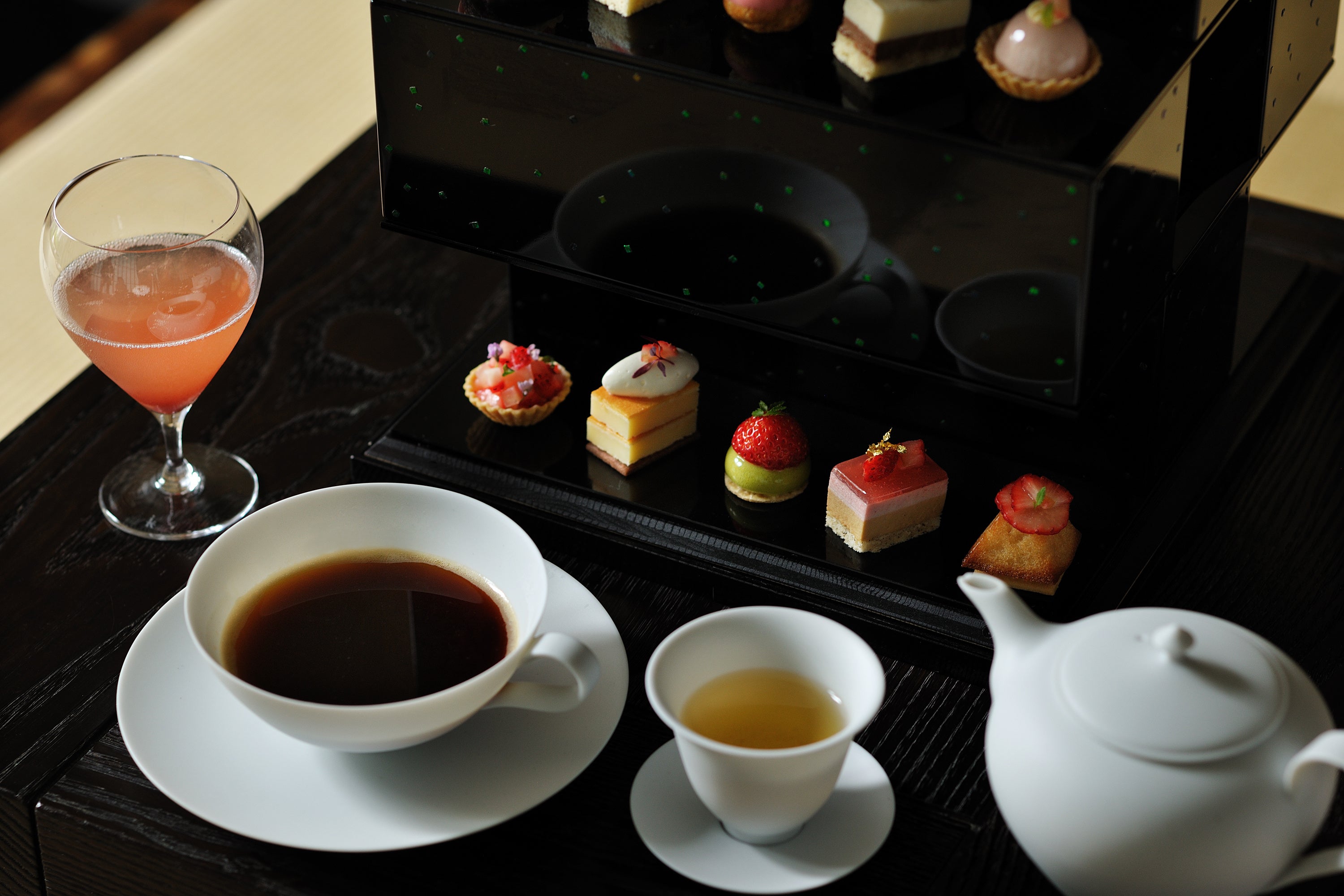 点心、主菓子、干菓子とそれぞれに合わせたペアリングを提供します。点心にあたる押し寿司には、苺のシロップとスパークリング日本酒のカクテルを合わせます。主菓子に合わせるのは、茶事のメイン・濃茶と同じように分け合って楽しめるフレンチプレスで淹れたオリジナルコーヒーです。スペシャルティコーヒー専門店「猿田彦珈琲」(代表大塚朝之(ともゆき)氏)の協力の元、このアフタヌーンティーのために、豆や焙煎度合いを選定しています。そして最後の干菓子は、香ばしい薪火(まきび)晩茶と一緒に味わいます。