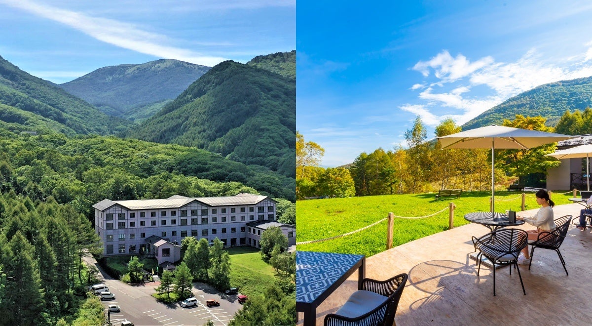 標高1,400mの高原に建つ、周囲をカラマツや白樺林に囲まれた温泉リゾート。