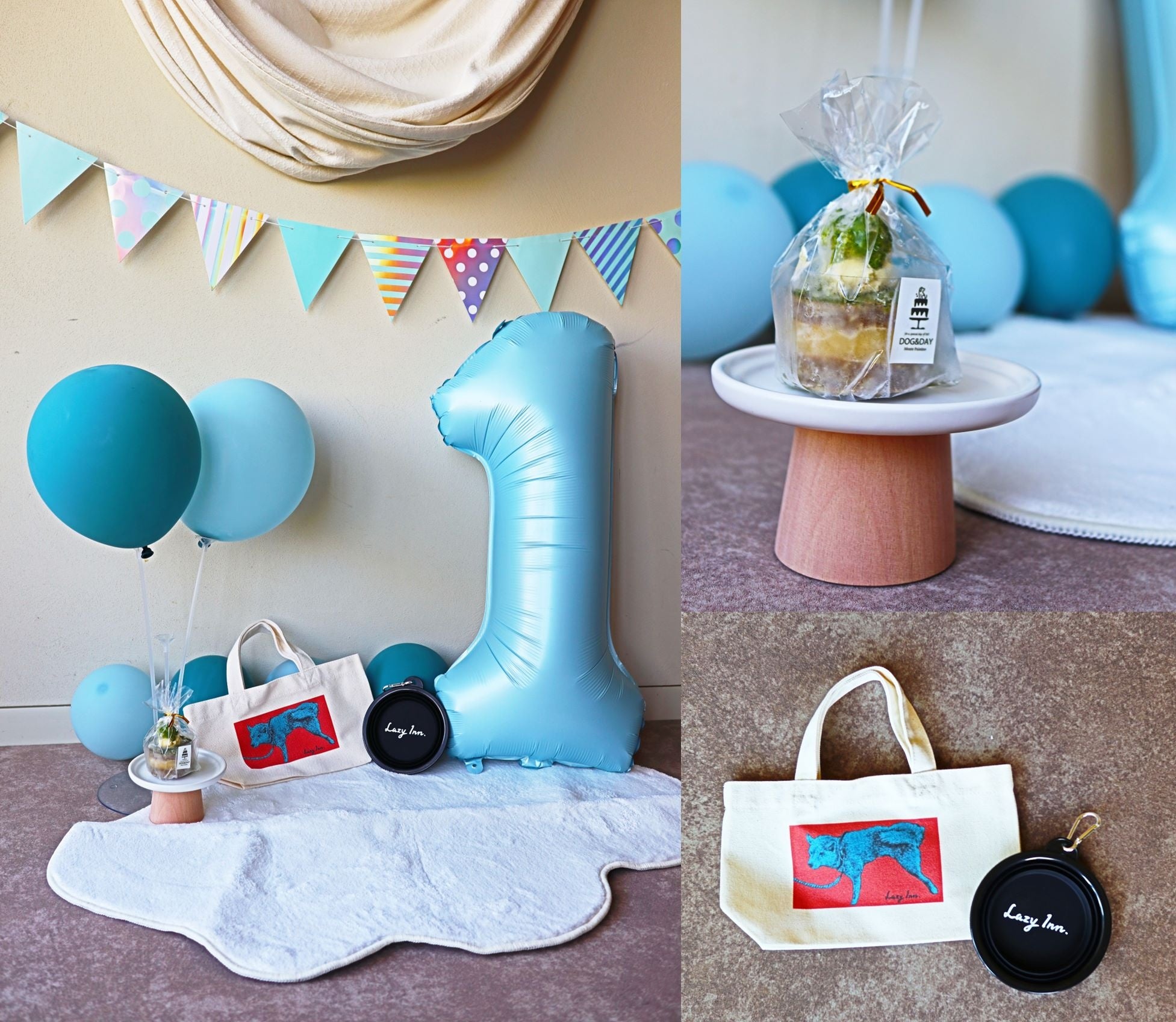 アニバーサリープランでご宿泊のお客様には、”わんちゃん用バースデーケーキ”、”Lazy Inn.オリジナルわんこお散歩グッズ”(トートバッグ・折りたたみコップ)をプレゼント。