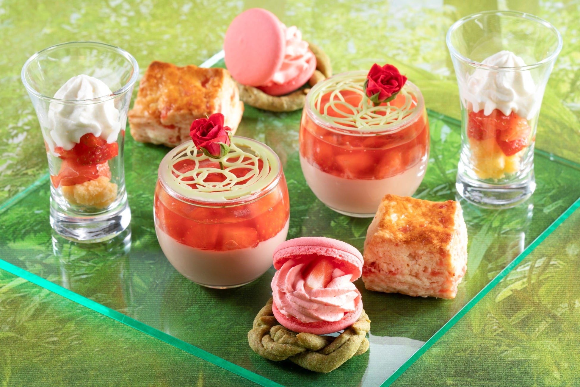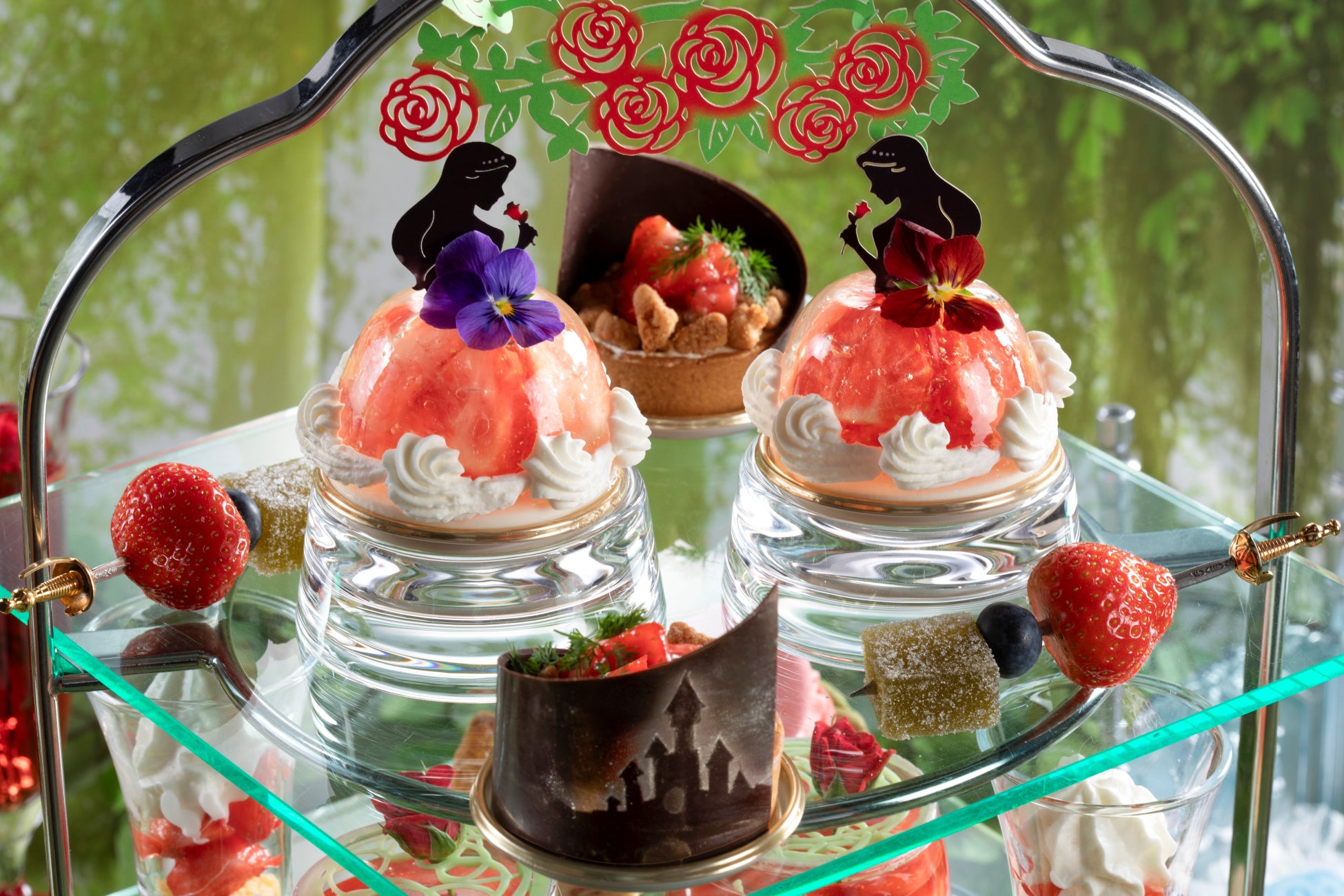 レストラン&ラウンジ・バー eu(ゆう)では、民話「眠れる森の美女」をテーマに、茨や紡ぎ車などをモチーフにしたスイーツやセイボリーが楽しめるアフタヌーンティーをご用意します。また、いちごをふんだんに使用し、眠れる森の美女の世界観を表現したカクテルもご用意しておりますので、お食事後におすすめです。