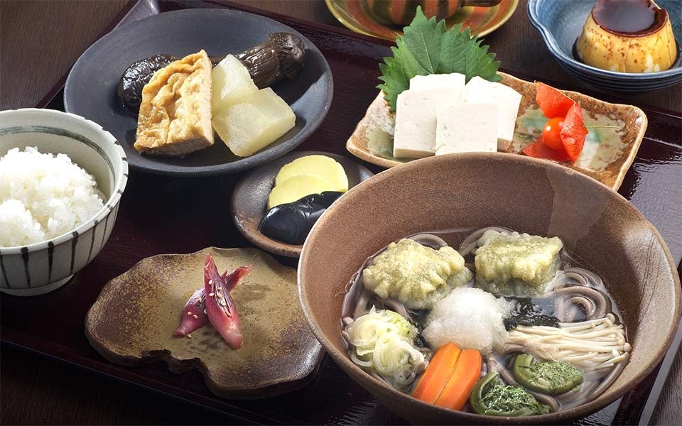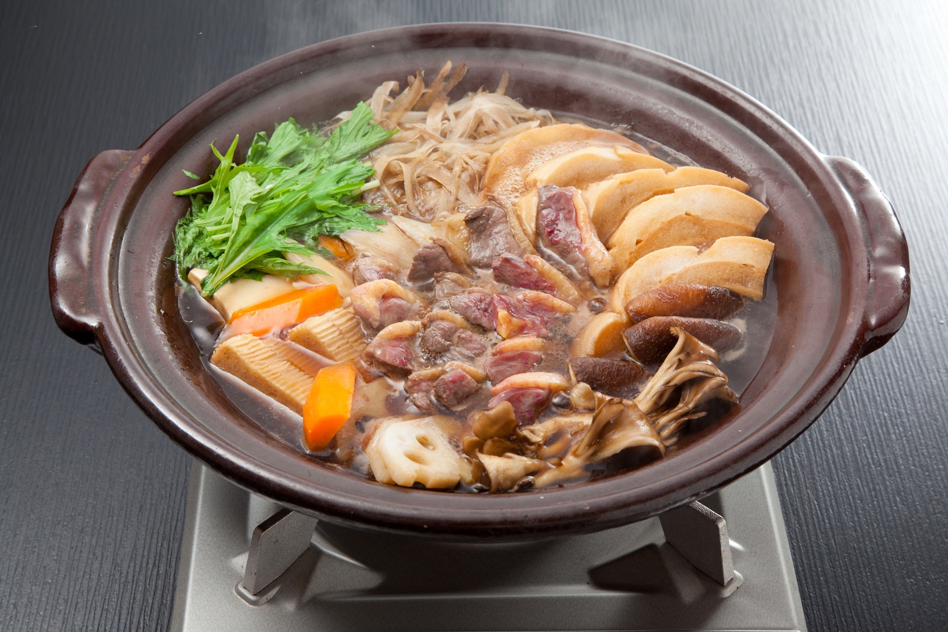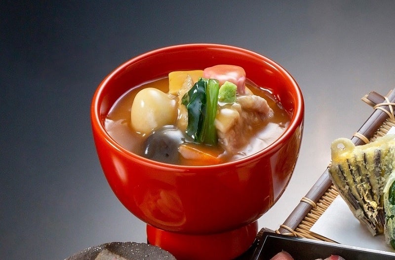 石川県を代表する鴨肉や鶏肉の切り身に小麦粉をまぶし、すだれ麩、野菜と共にだし汁で煮る椀物で、薬味にわさびを添えて食べます。片栗粉が肉のうまみを閉じ込め、汁に適度なとろみをつけます。