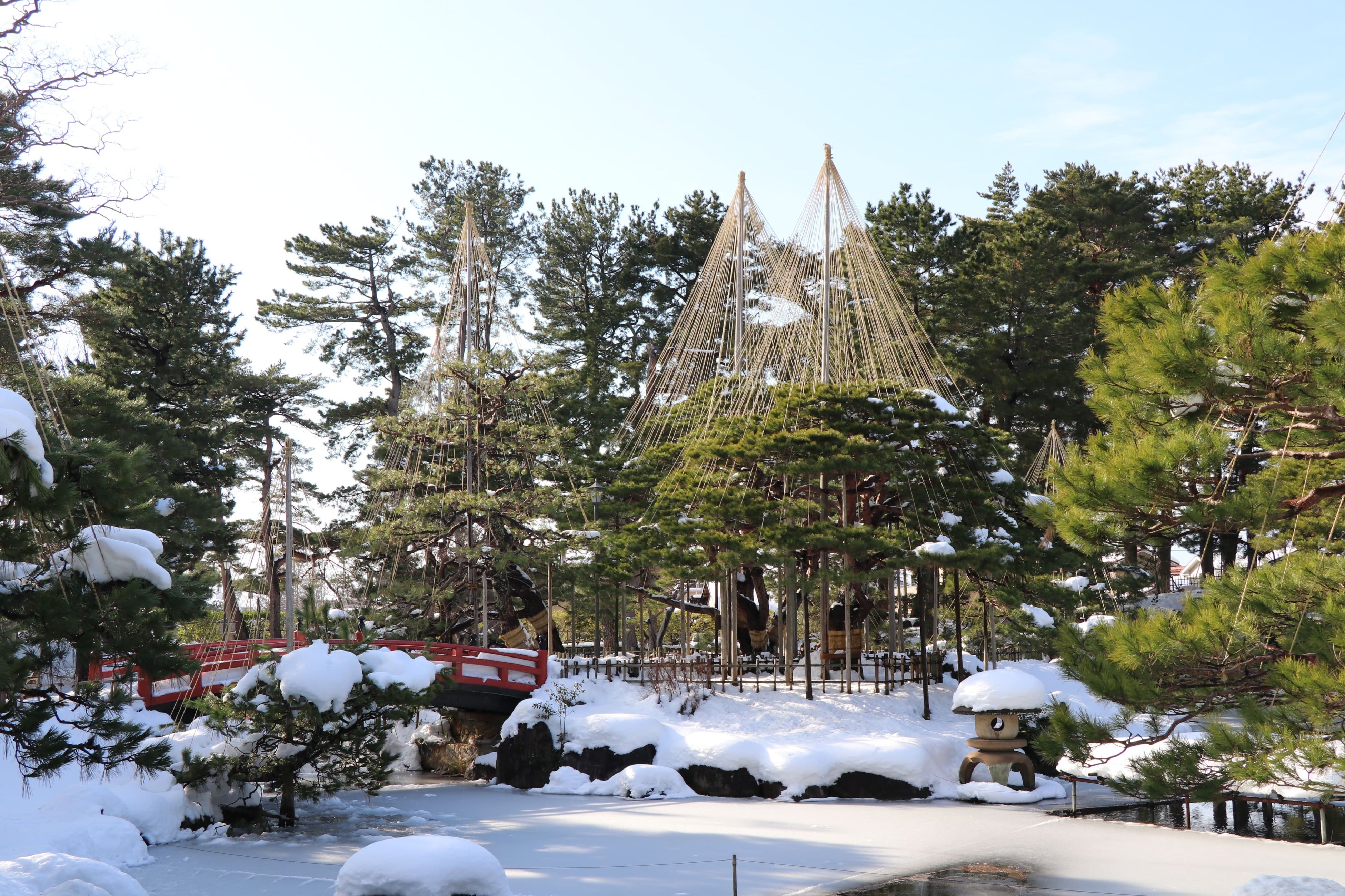 芦城公園は、小松城の三の丸跡に作られた和風公園です。園内には、博物館をはじめ、美術館、図書館、茶室などの文化施設を有し、中央には二つの池と滝があります。春は桜やツツジ、夏は新緑と水辺、秋は紅葉、冬は雪吊り松などと四季折々で楽しむことができますが、冬の雪吊りは北陸ならではの景色。雪吊りとは雪の重みで樹木が折れないように縄で吊って支えるもので、冬の風物詩です。