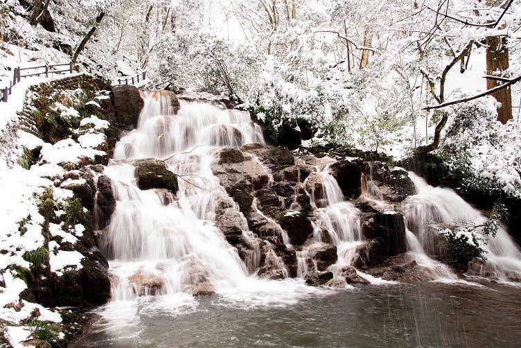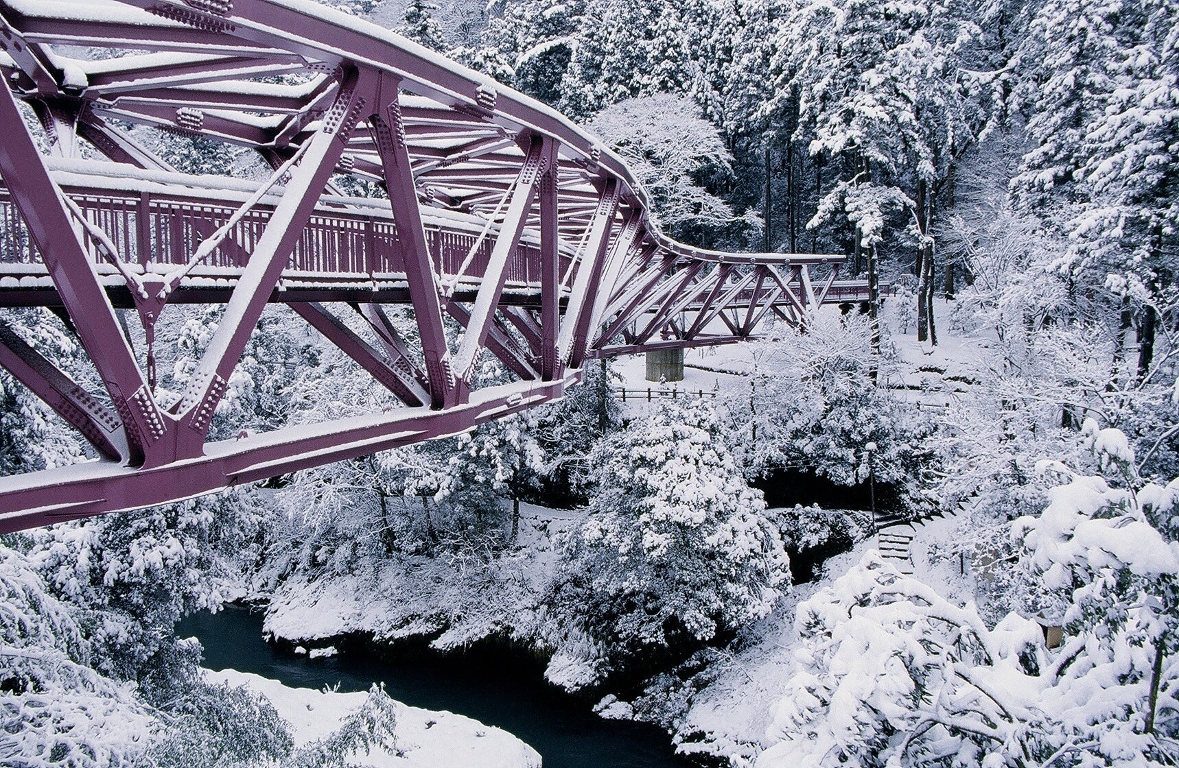 「鶴仙渓」の雪景色は、まるで繊細な水墨画のように美しいと言われています。中でも、白く染まった渓谷と雪化粧が施された総檜造りの「こおろぎ橋」を目の前にすれば、その澄んだ美しさが心にまで染みわたります。その他、S字型の斬新なデザインの「あやとりはし」や松尾芭蕉を祀った「芭蕉堂」、書院造りの武家屋敷に九谷焼や尾形光琳の作品を展示した「無限庵」など見どころ満載のスポットとなっています。