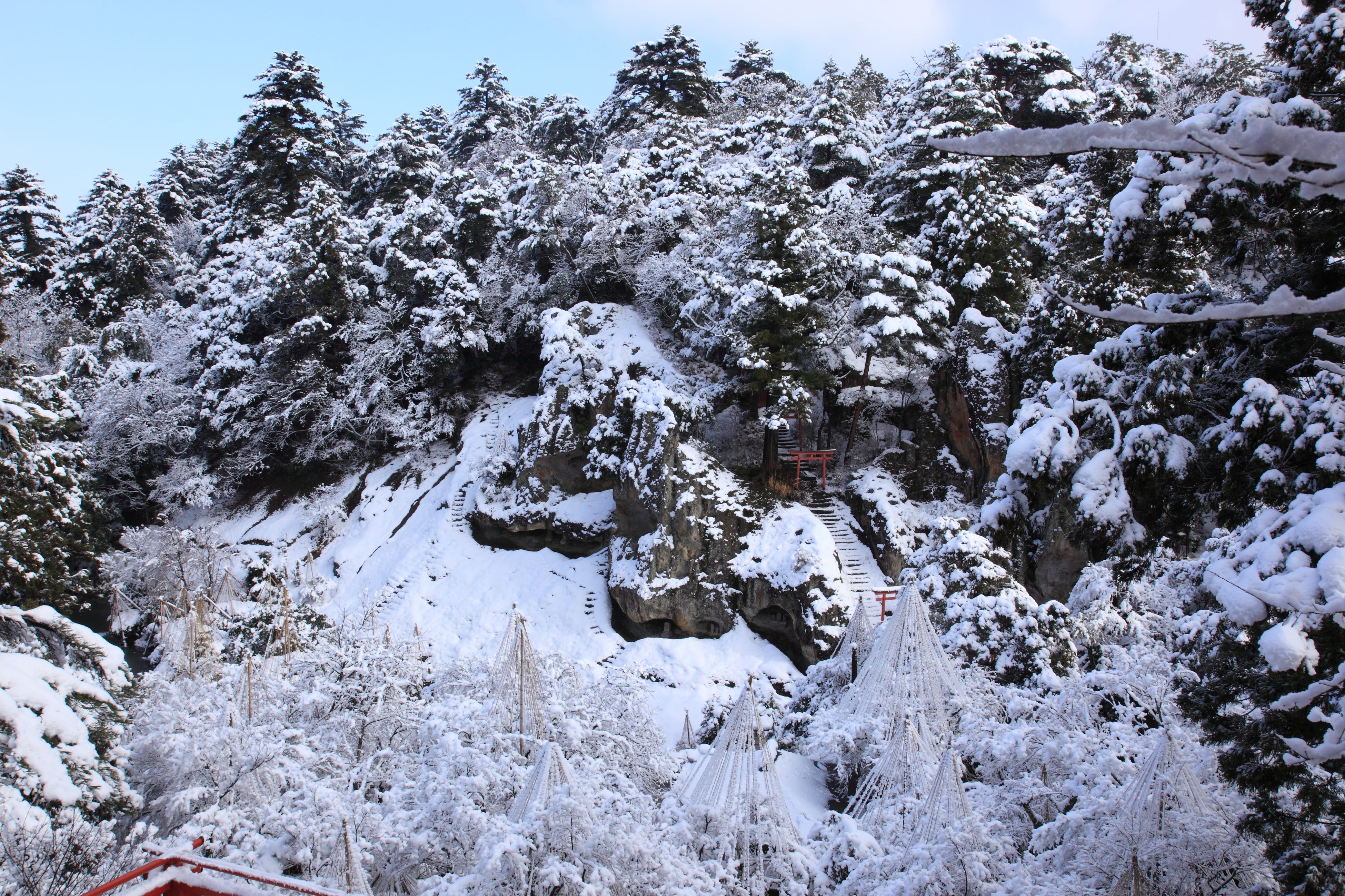 日本を訪れる外国人観光客向けガイドブック「ミシュラン・グリーンガイド・ジャポン」で1つ星の認定を受けた那谷寺は紅葉の時期だけではなく、冬の雪景色にも独特の美しさがあります。静寂な白銀の雪景色に真っすぐ伸びる参道境内には北陸独特の雪吊りが施されており、雪の狭間から見える緑が侘び寂びとした美しさを演出します。また、初詣では、金堂でのご参拝、本殿では胎内くぐりをして罪を流し、清らかな心で新年を迎えることができます。