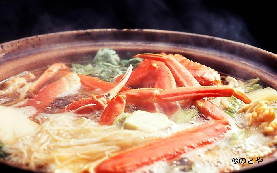 カニの旨みを十分に楽しむには旬の野菜と楽しむ「カニすき」がおすすめで、出汁が十分に出てシメまで美味しい鍋は温泉街でも定番の冬の贅沢鍋です。